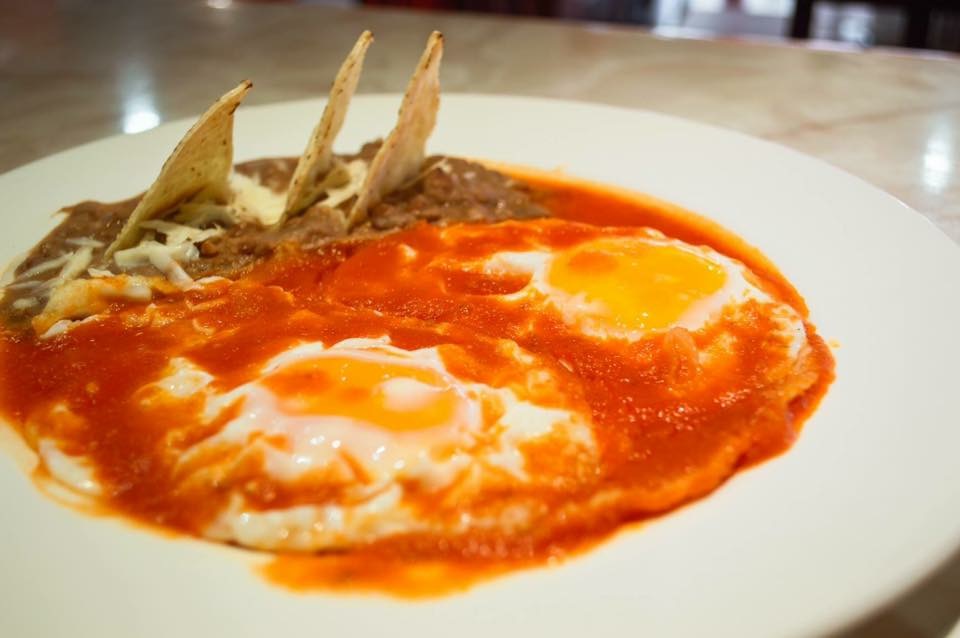 Huevos estrellados bañados en salsa roja, acompañados con frijoles refritos.