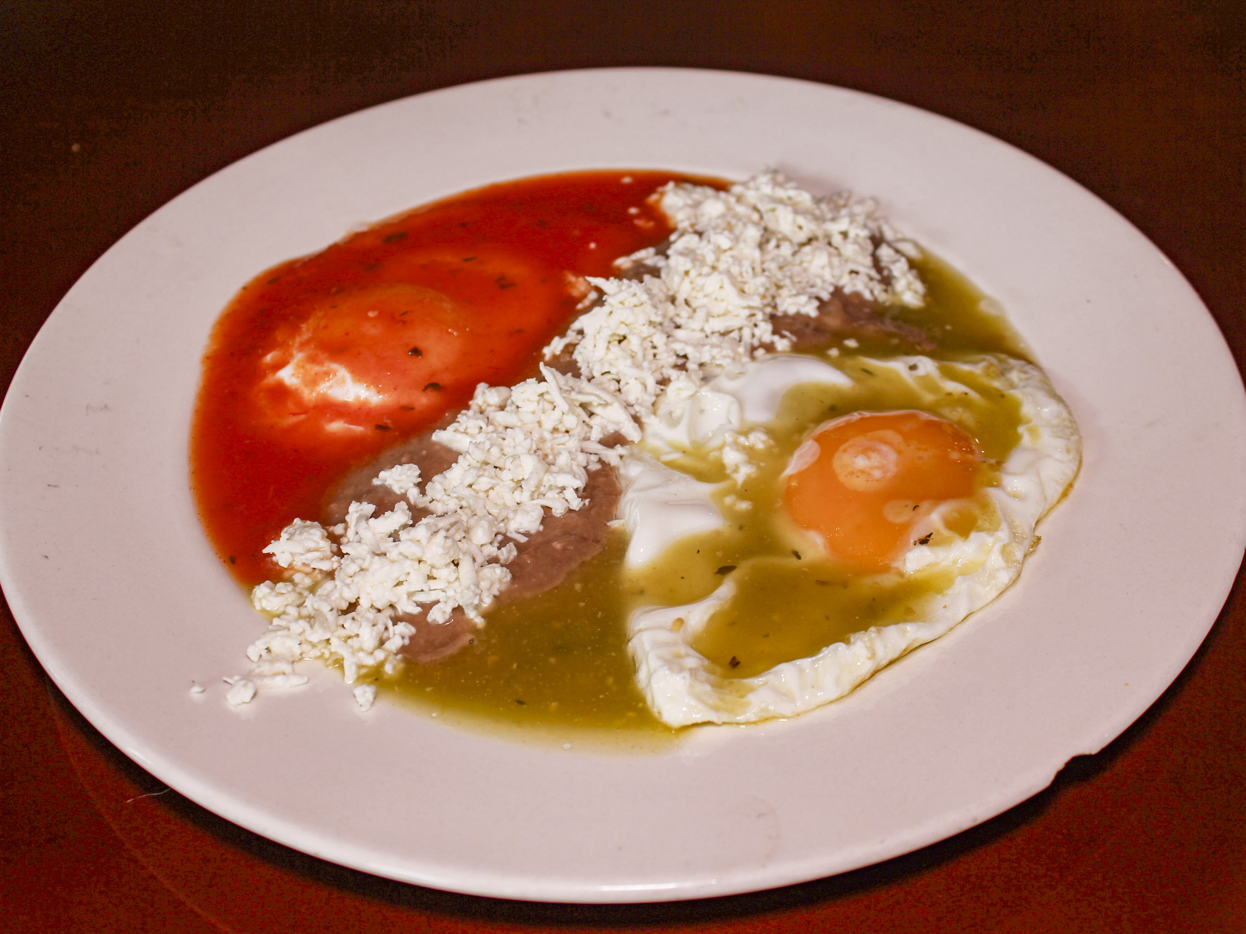 Huevos estrellados bañados en salsa roja y verde, acompañados con frijoles refritos.