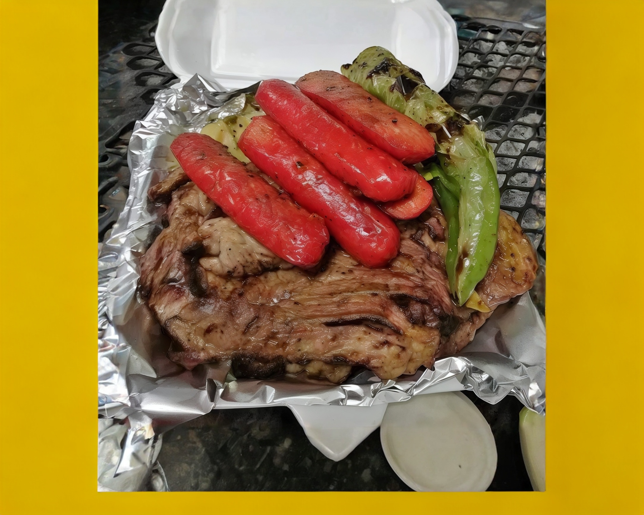 250 gr De arrachera asada, 250 ml de frijoles charros, salchicha roja asada, cebollita caramelizada, chiles toreados, pico de gallo, tortillas y salsa.
