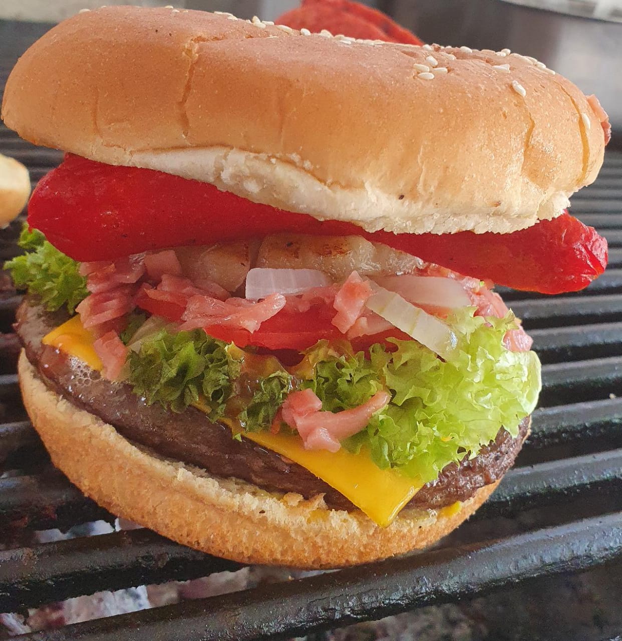 Añadimos salchicha roja asada a nuestra hamburguesa con carne de res, queso amarillo, jamón, tocino, jitomate, cebolla caramelizada y lechuga.