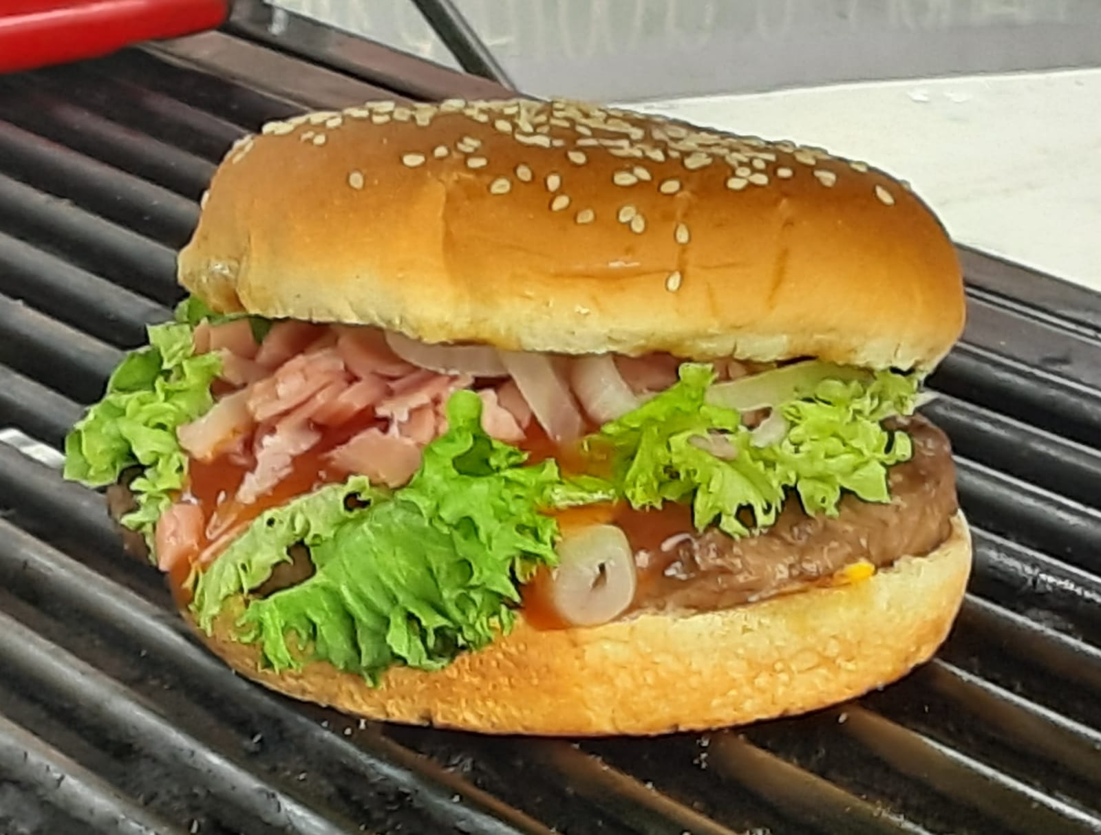 Deliciosa hamburguesa con carne de res, queso amarillo, jamón, tocino, jitomate, cebolla caramelizada y lechuga.