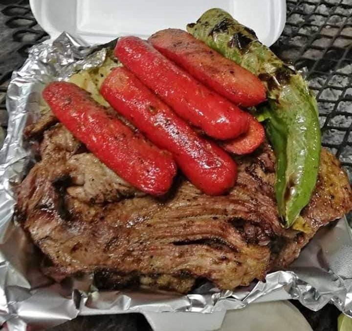 1 kg De arrachera asada, 1 L de frijoles charros, salchichas rojas asadas, cebollita caramelizada, chiles toreados, pico de gallo, tortillas y salsa.