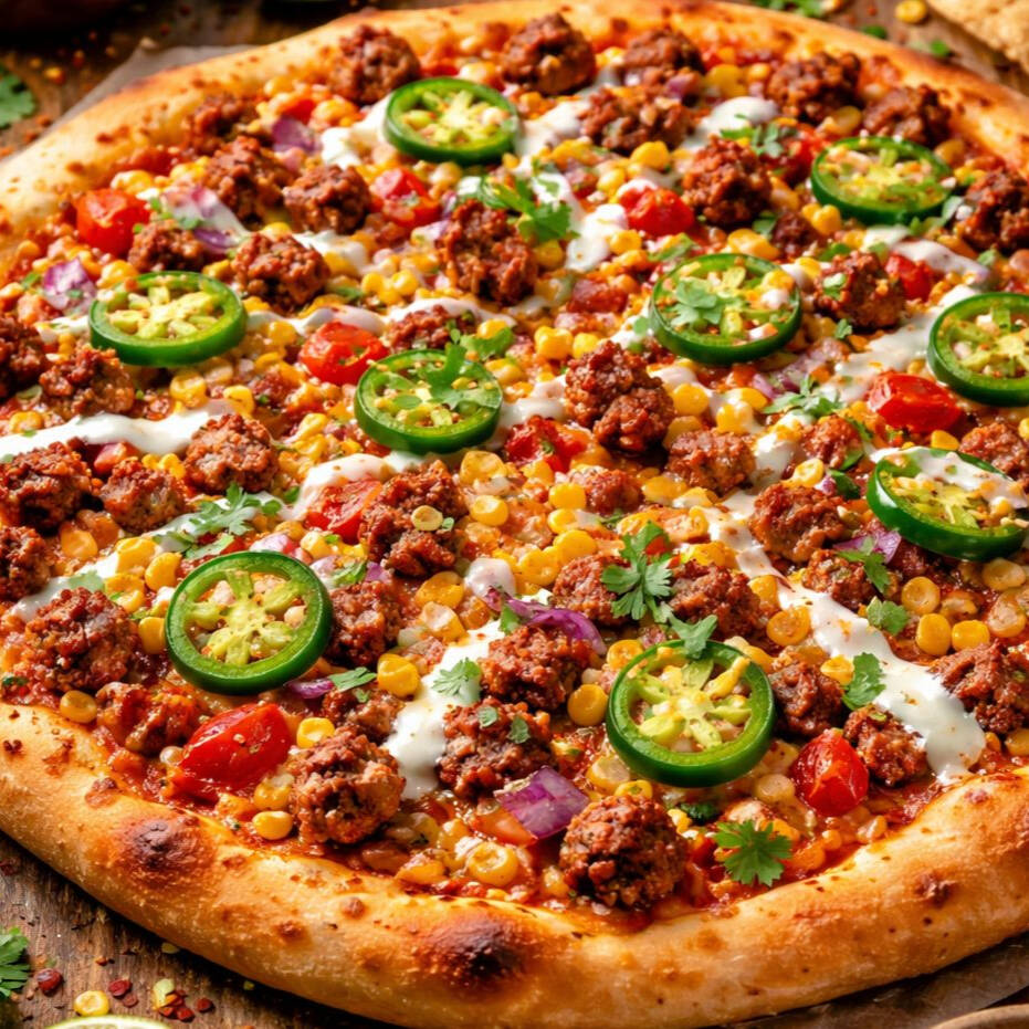Pizza con queso, chorizo, cebolla, salchicha y jalapeño