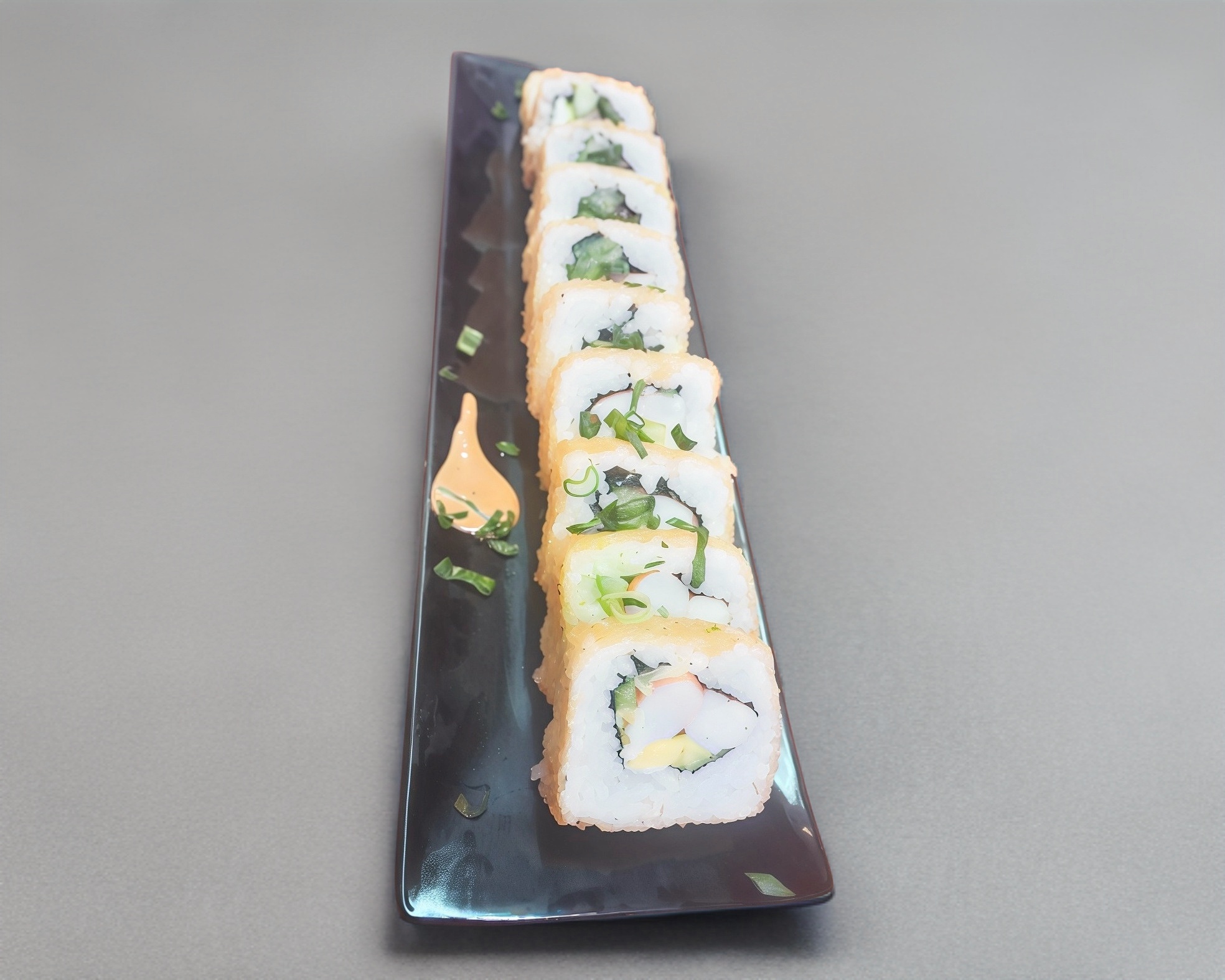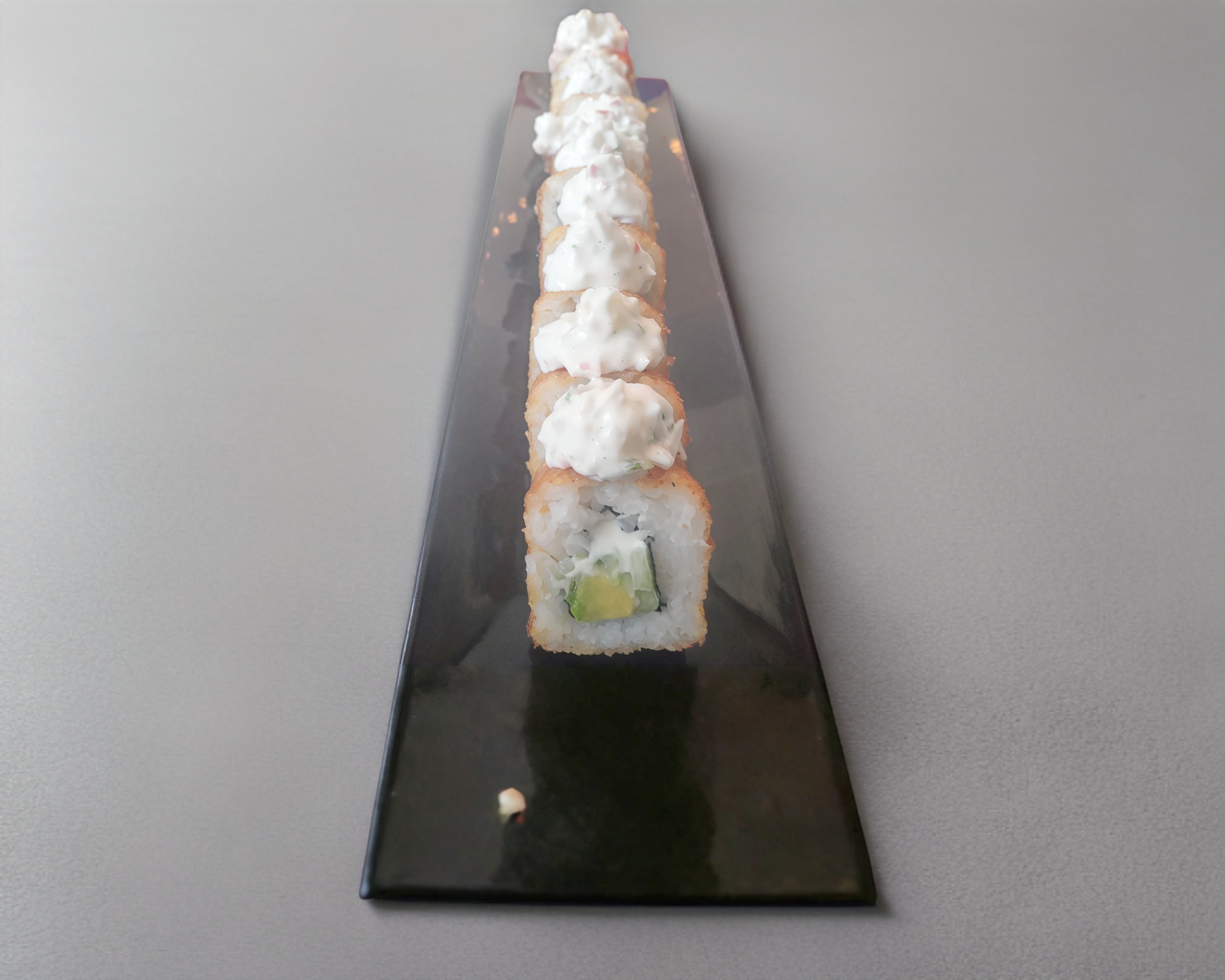 Cubierto de ajonjolí, sriracha, mayo chipotle, cebollín, relleno de camarón Philadelphia, aguacate y pepino.