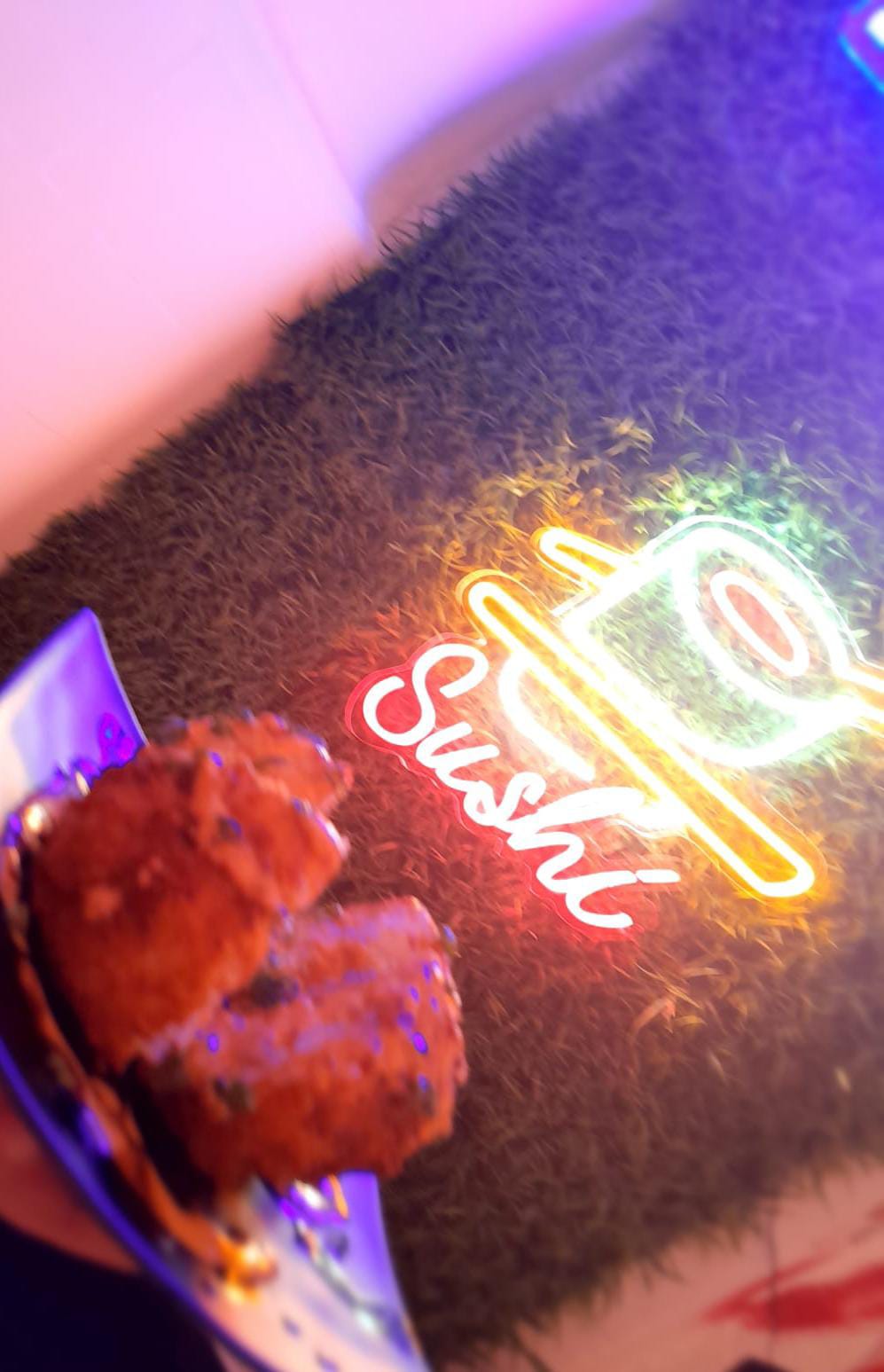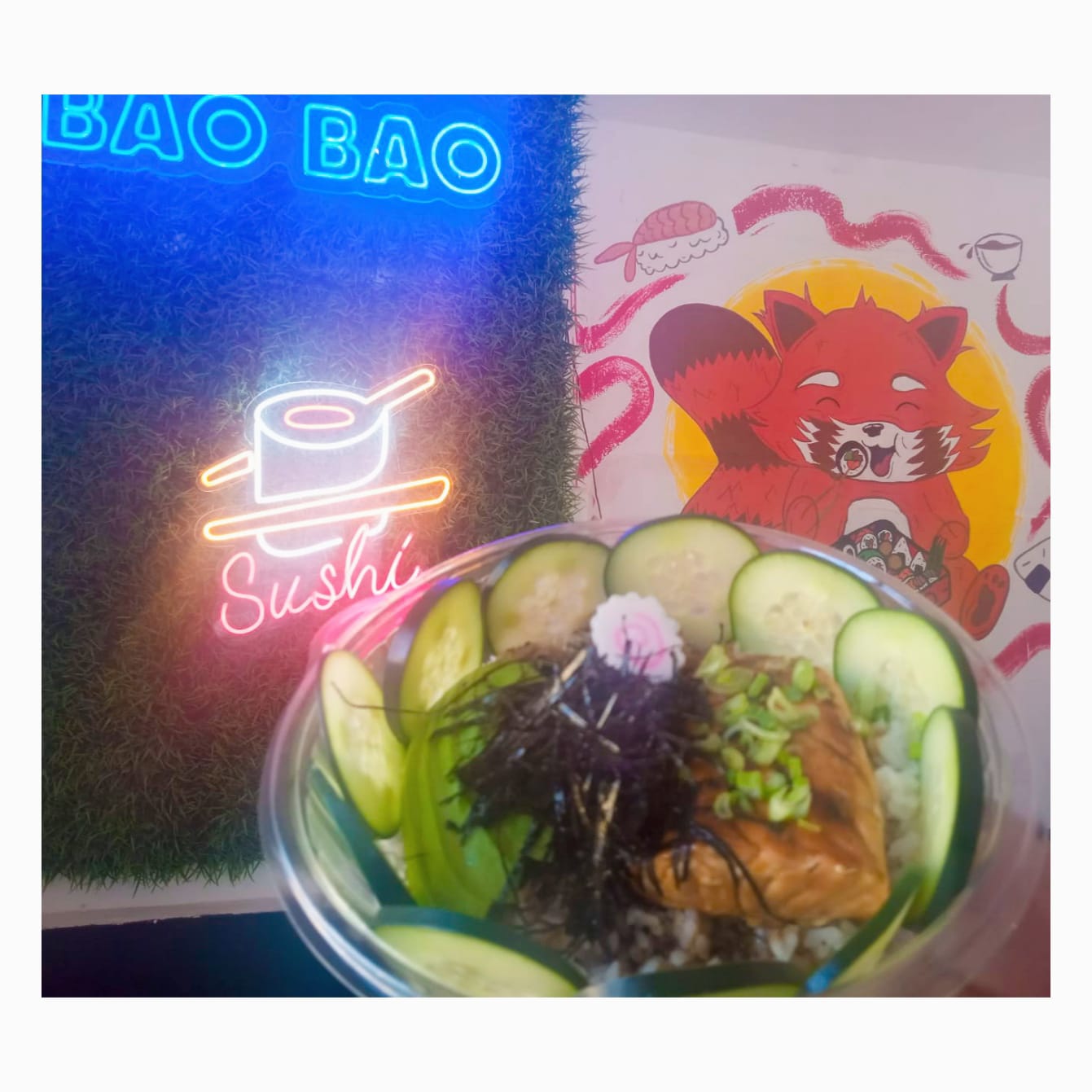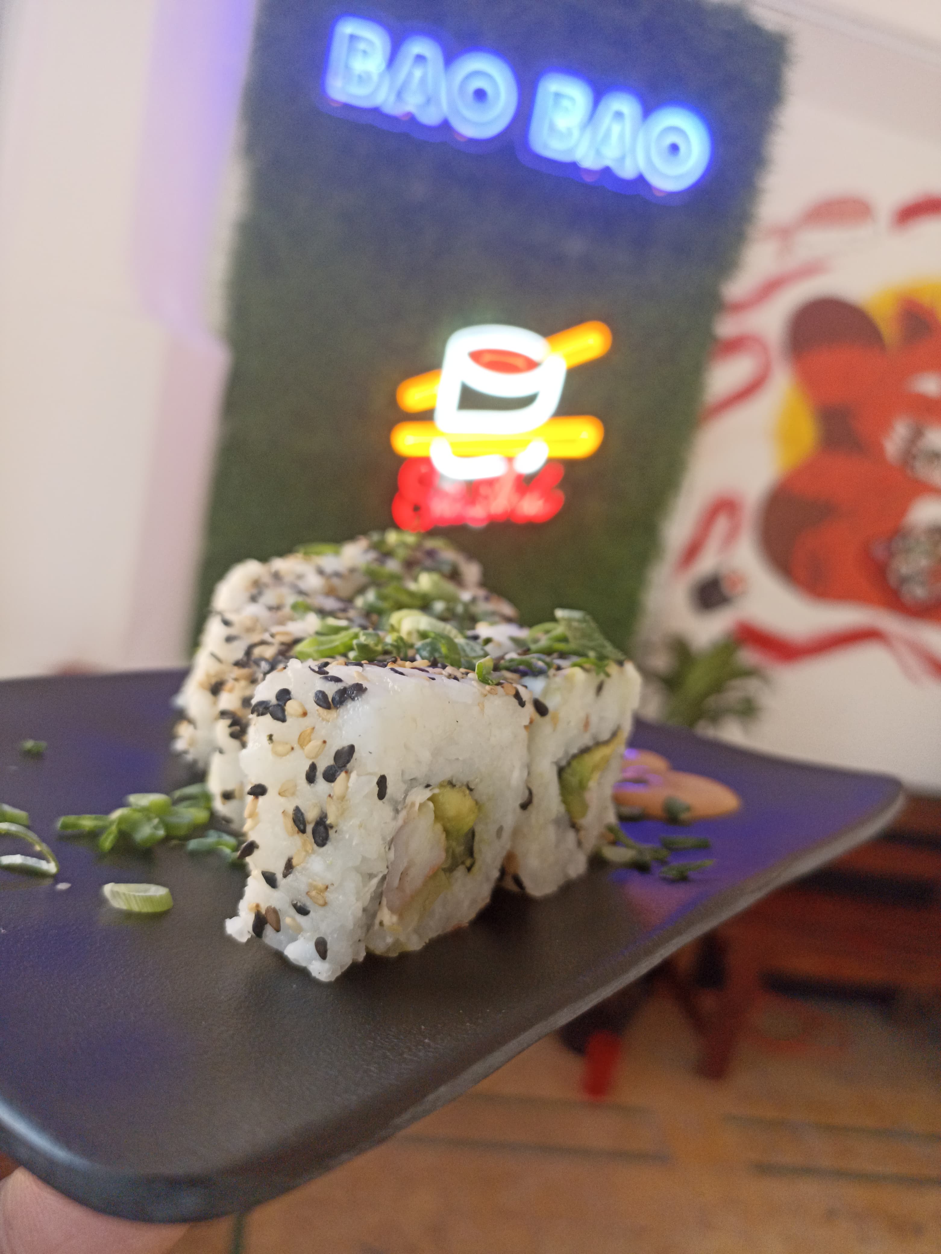 Salmón spicy, mango, arroz shari, alga nori, anguila, cebollín, aguacate y pepino.