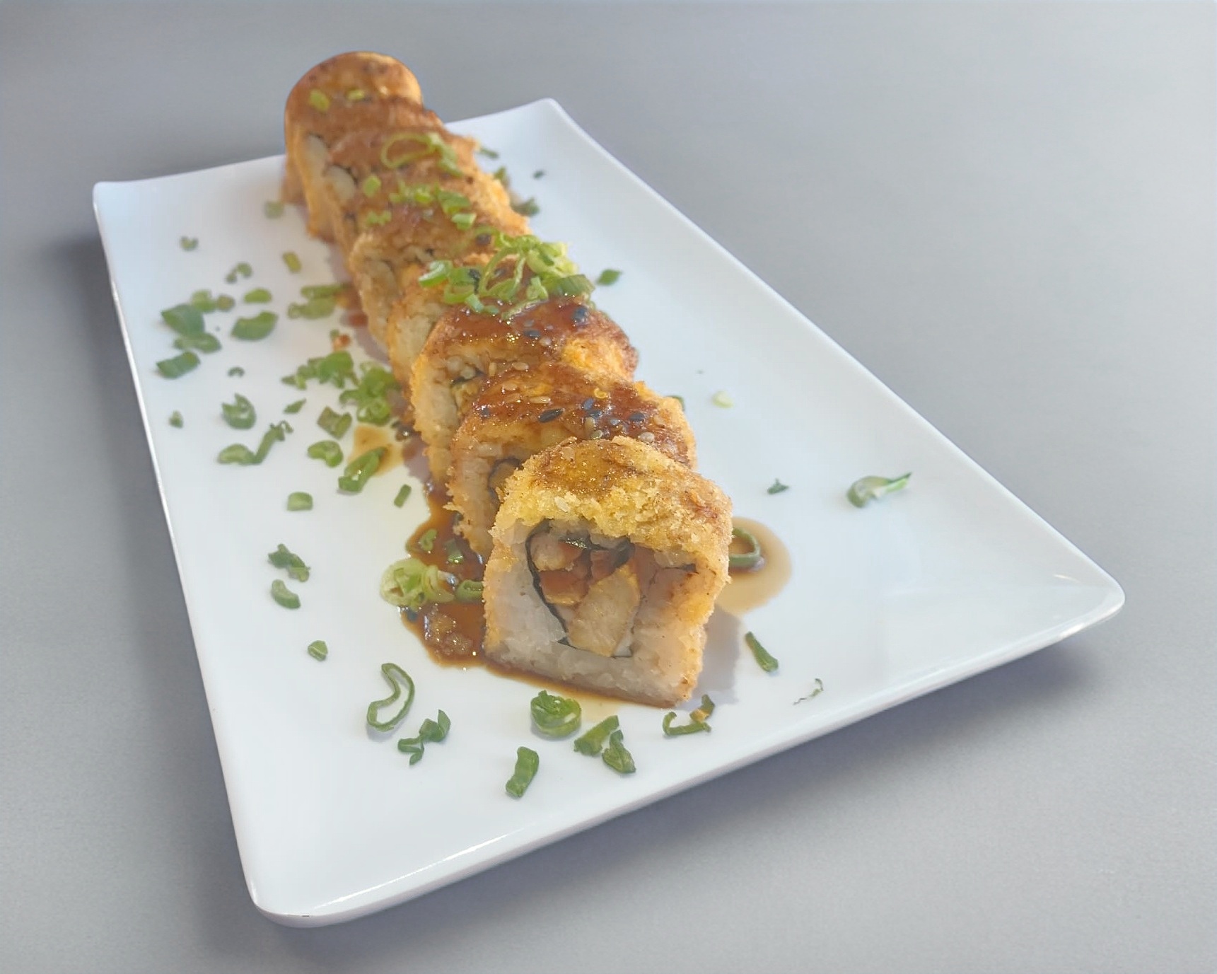 Relleno de Philadelphia, aguacate y pollo teriyaki, cubierto de salsa teriyaki.