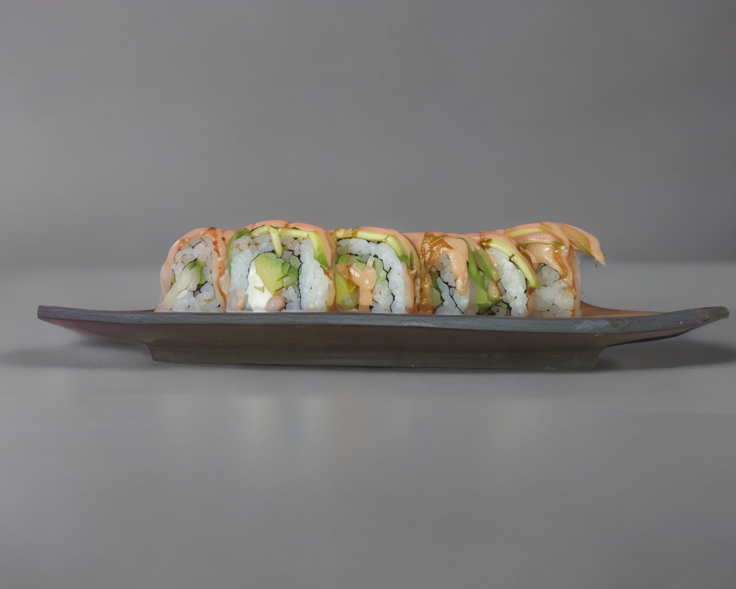 Relleno de Philadelphia, camarón, pepino, aguacate, cubierto de aguacate, mayo chipotle y anguila.