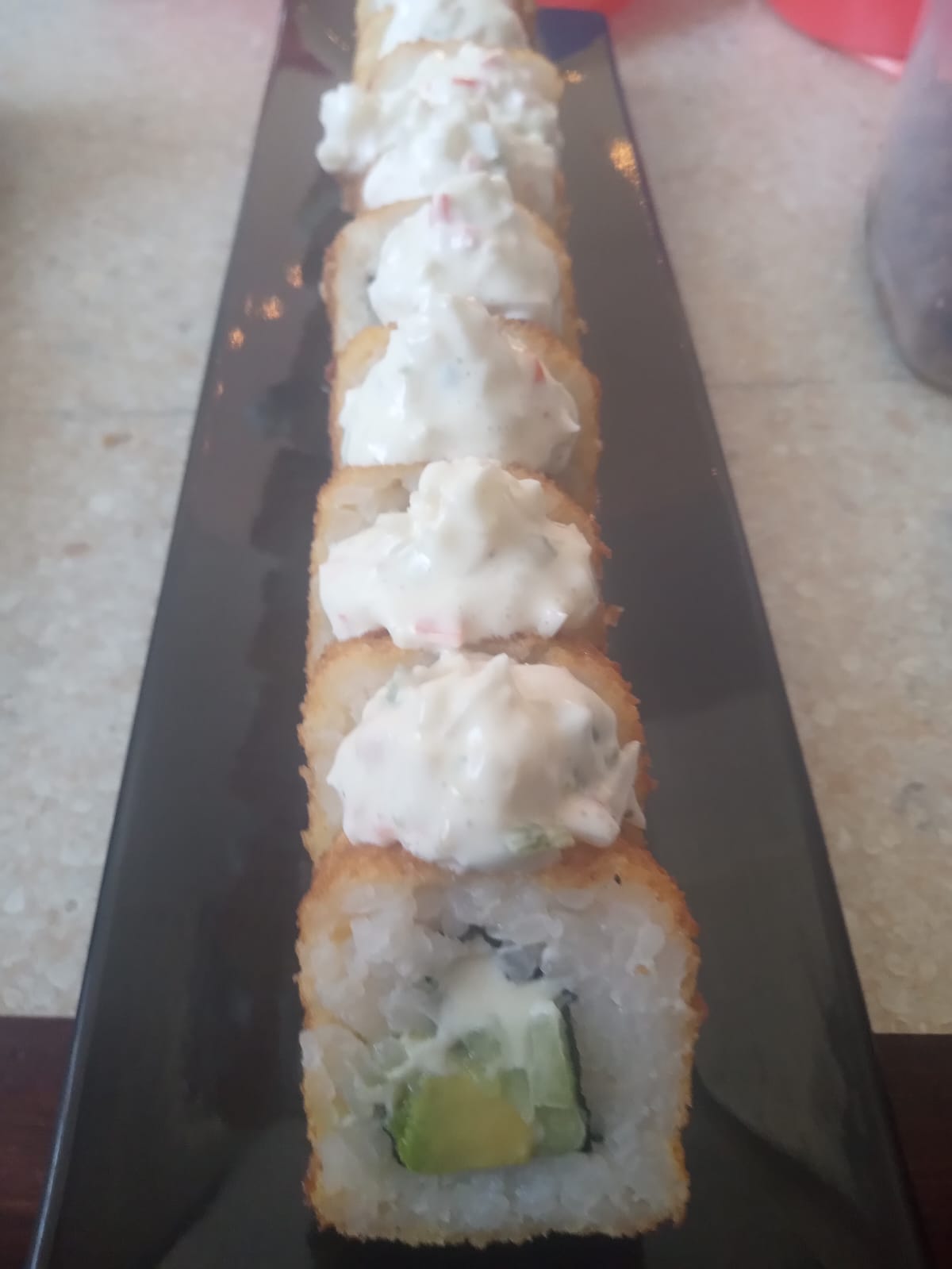 Relleno de Philadelphia, pepino, aguacate, salmón, cubierto de spicy tampico, mayo chipotle y sriracha.
