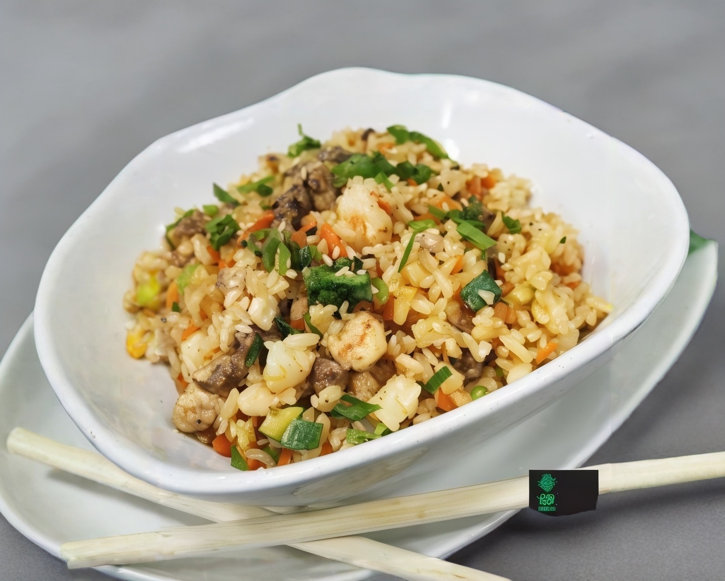 Fideos salteados con vegetales, pollo, arrachera y camarón con salsa yakisoba.