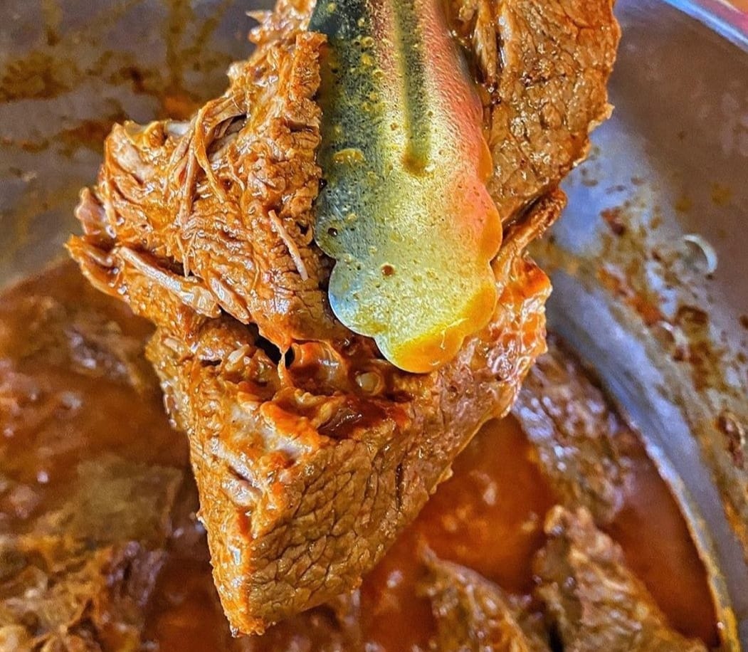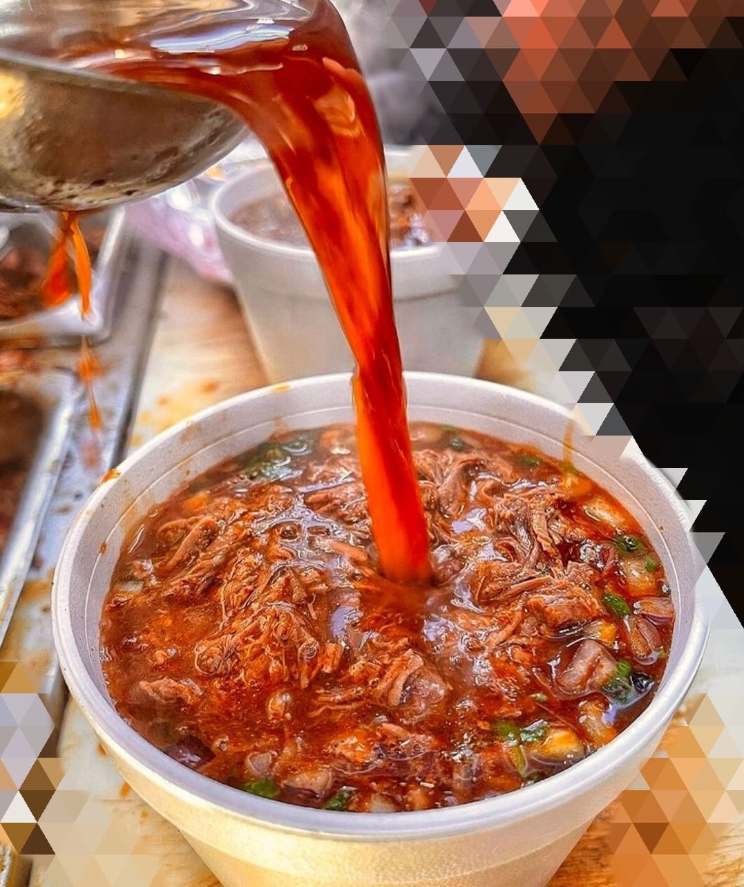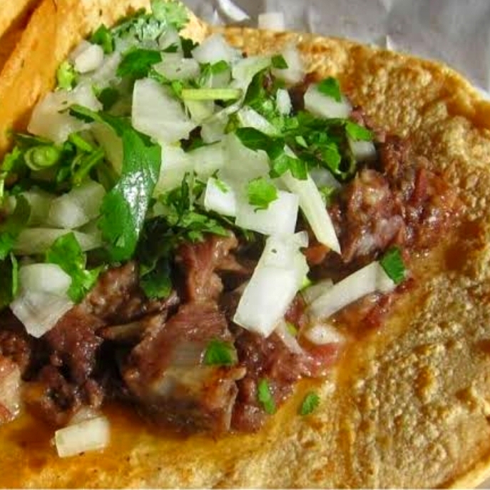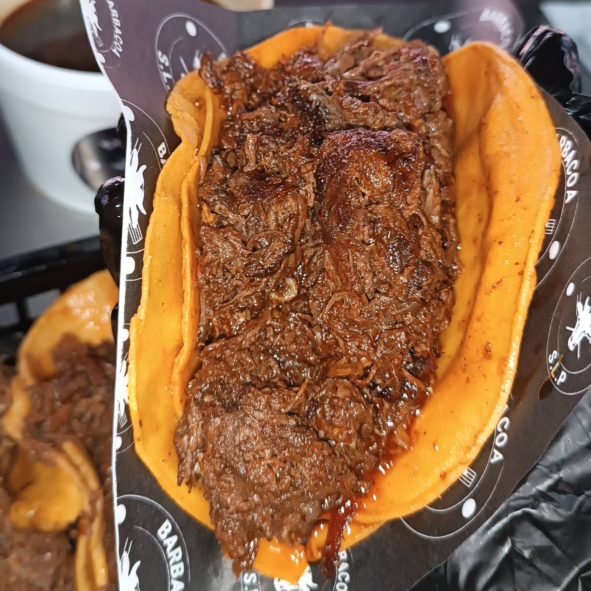 Taco de doble tortilla bañado en grasa de birria, relleno de nuestra BarbacoaSLP.
