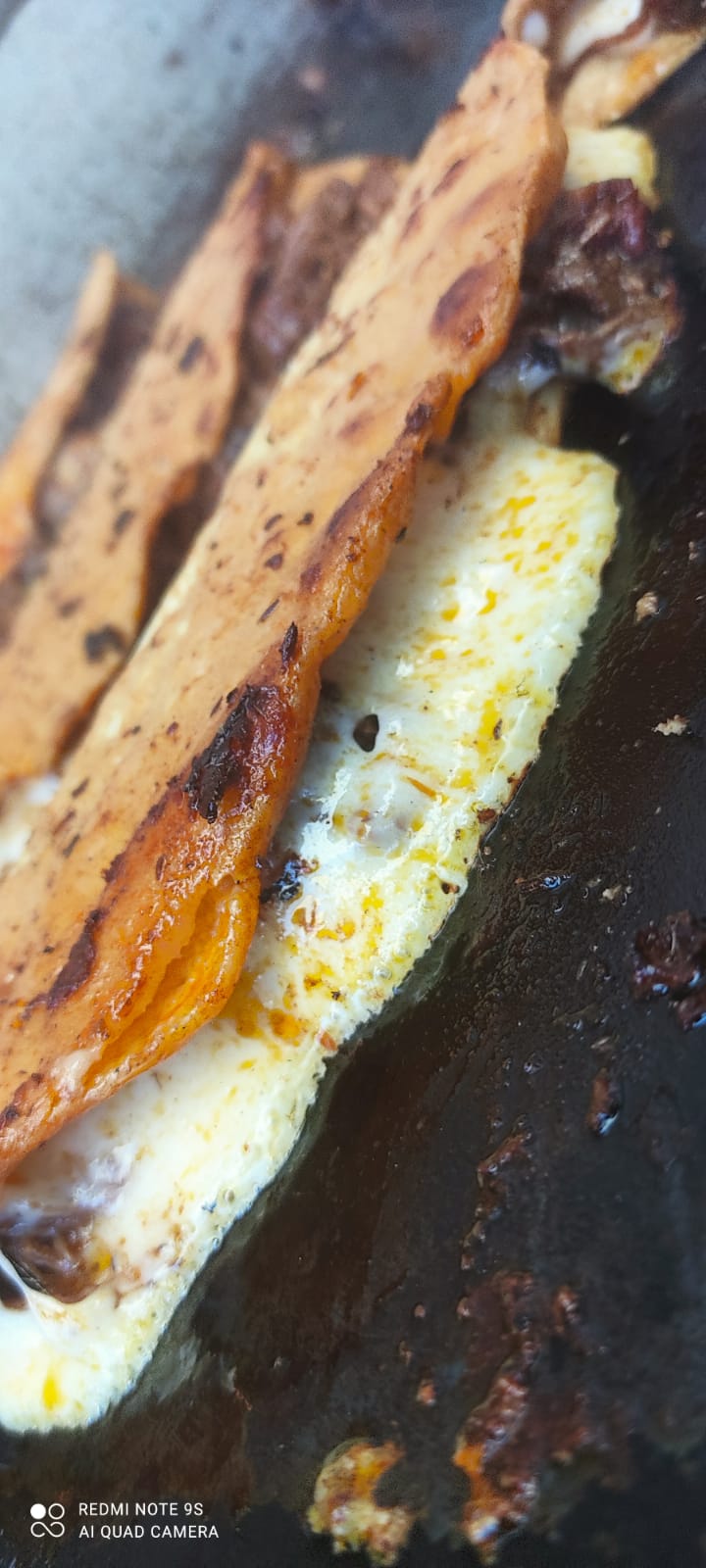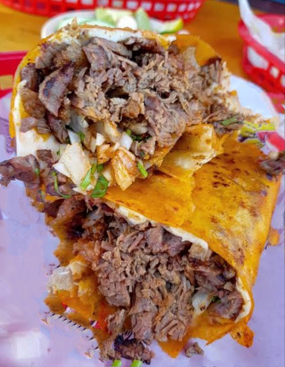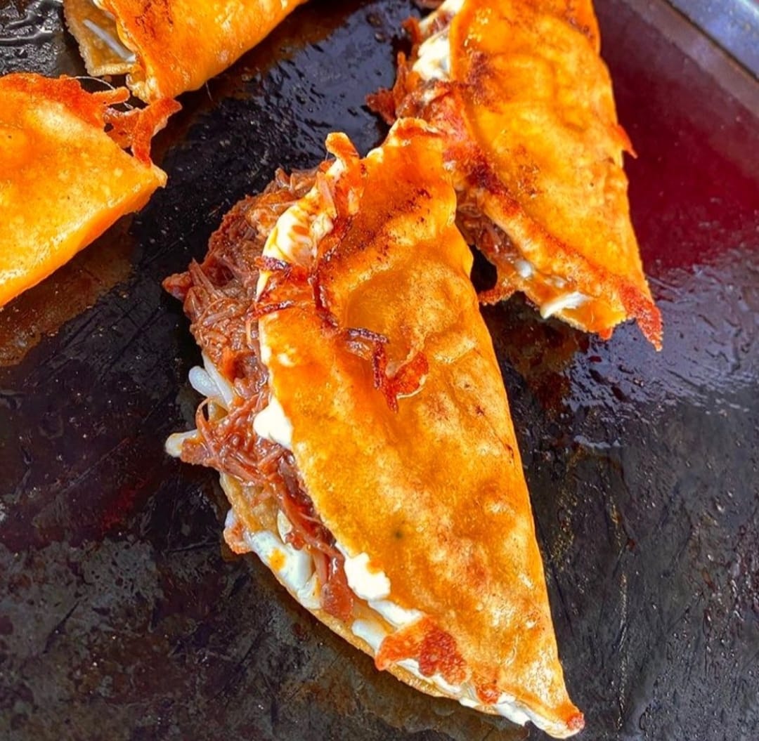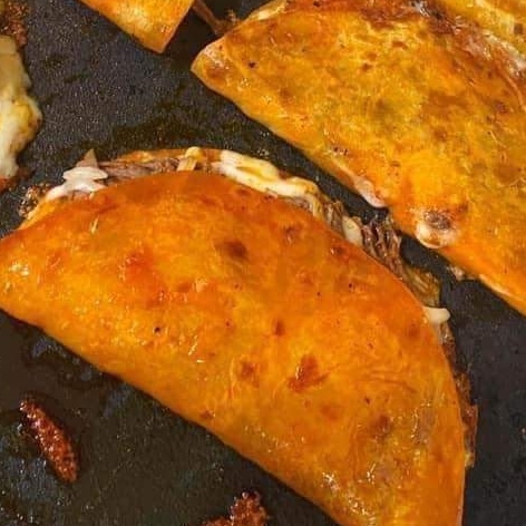 Tortilla de harina de 10cm bañada en grasa de birria y rellena de la misma con queso asadero.