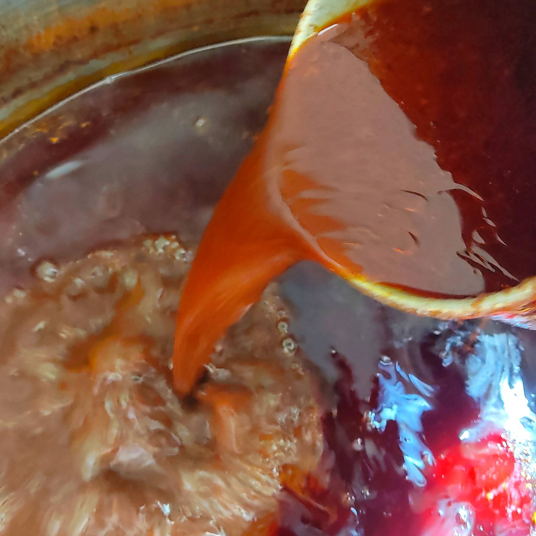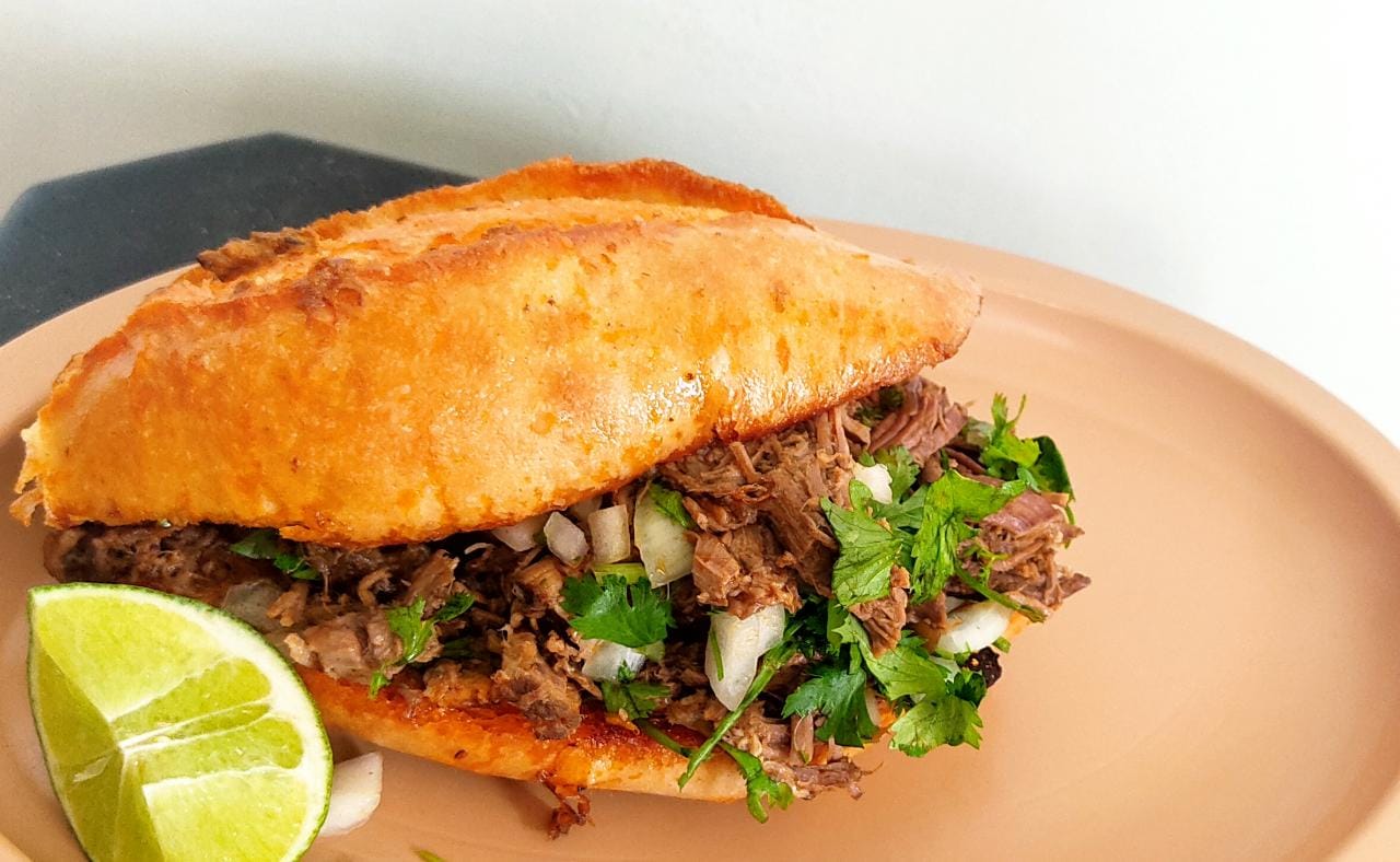 Bolillo caliente bañado en grasa de birria y relleno de la misma.