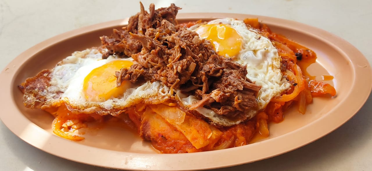 Deliciosa BarbacoaSLP sobre Chilaques con nuestra salsa roja, acompañado de 2 huevos estrellados y frijoles.