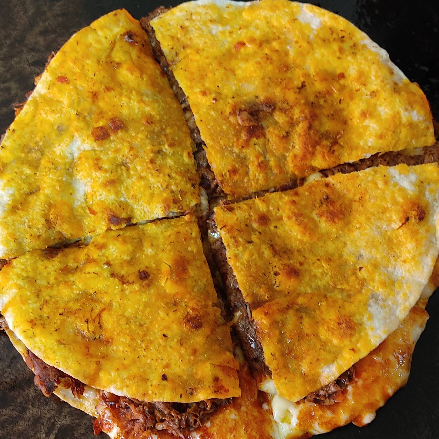 Doble tortilla de harina de 24cm bañada en grasa de birria y rellena de la misma con queso asadero.
