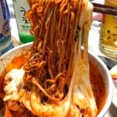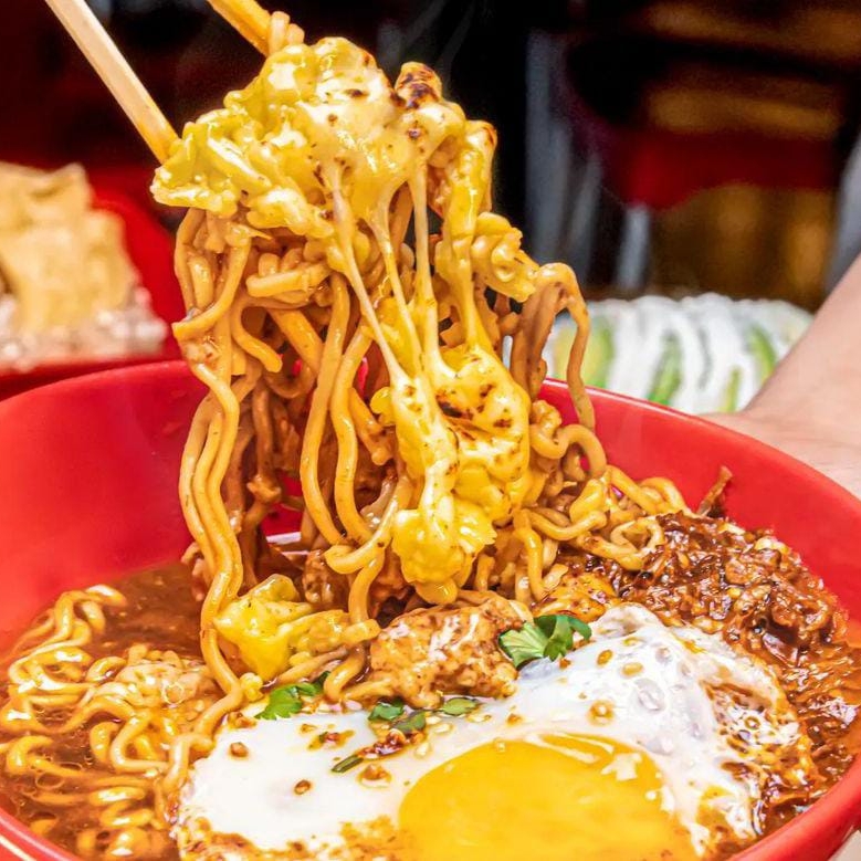 Fideos instantáneos sobre consomé, acompañado de BarbacoaSLP, huevo, queso y cebollín.
