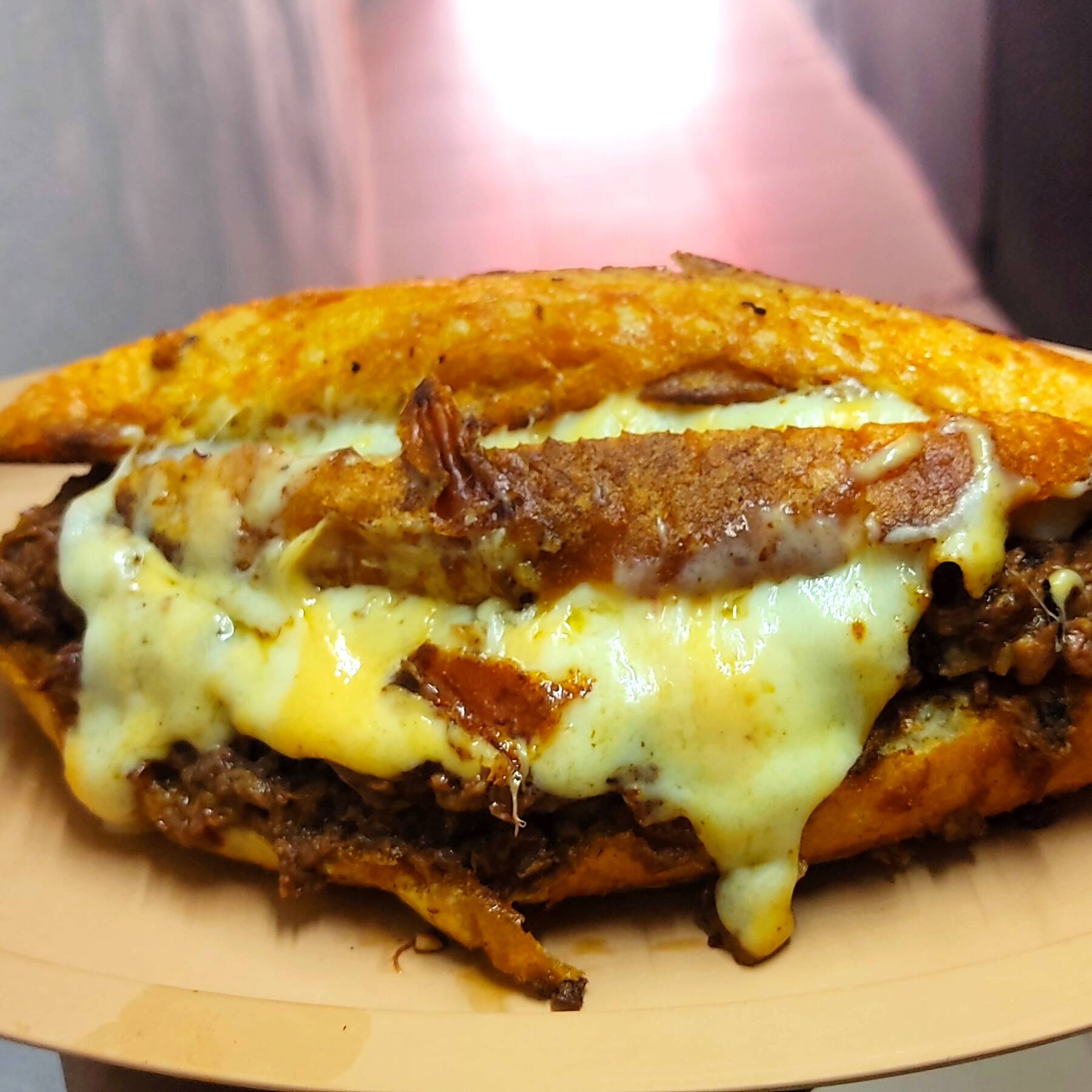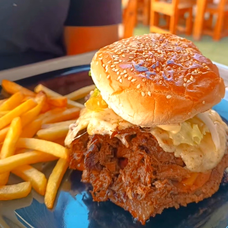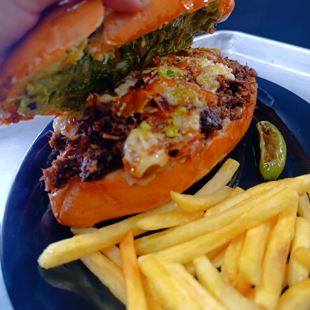 Pan artesanal relleno de BarbacoaSLP, queso gratinado, frijoles refritos, aguacate y acompañado de papas a la francesa.