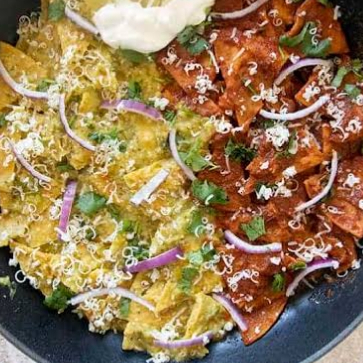 Chilaquiles con salsa y proteina a elegir, acompañados de frijoles refritos.