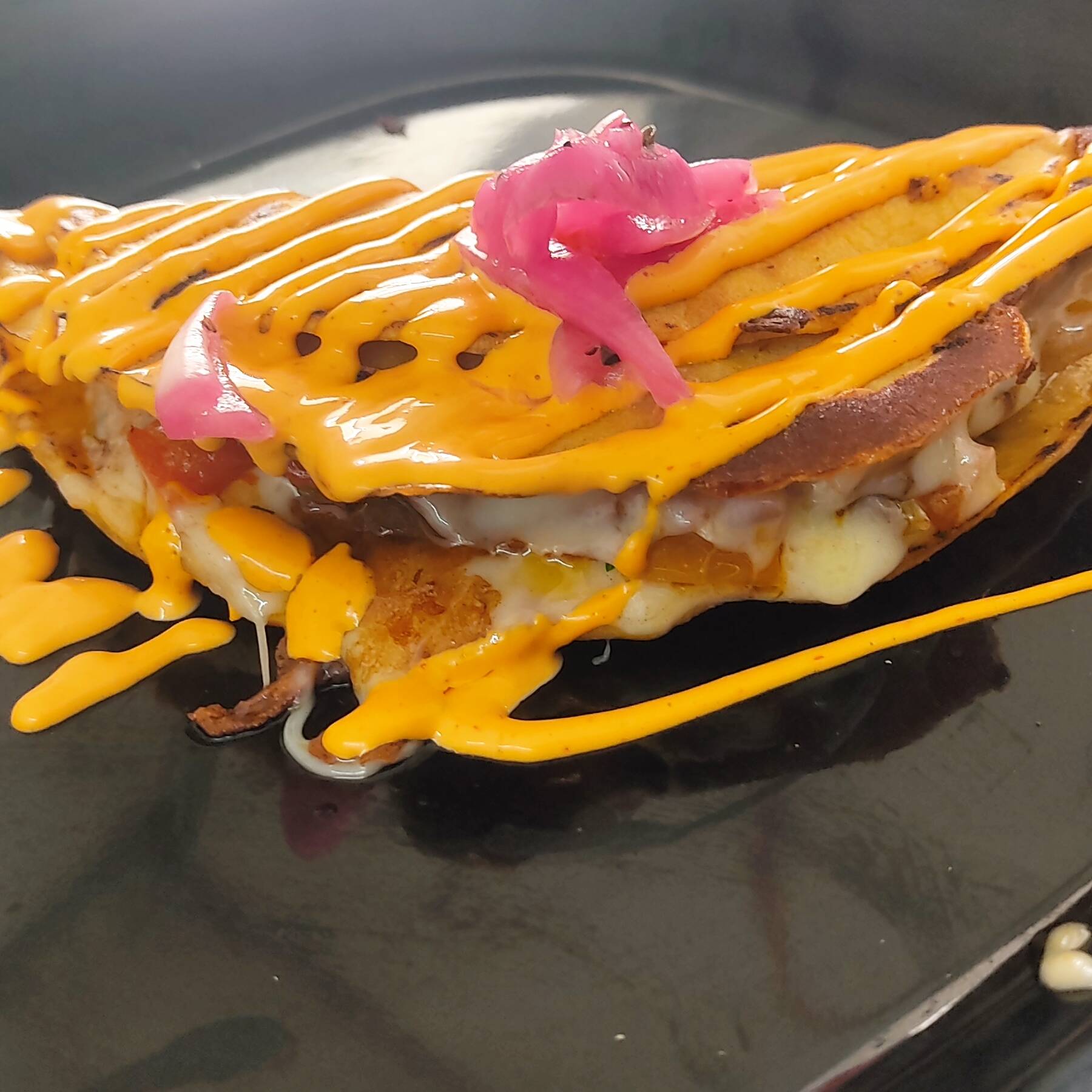 Tortilla hecha a mano con queso gratinado, camarón y aderezo chipotle.