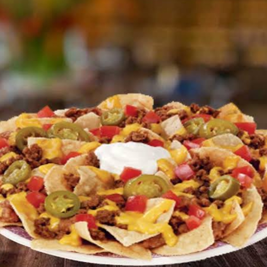 Totopos con frijoles, queso amarillo, pico de gallo y chiles en vinagre.