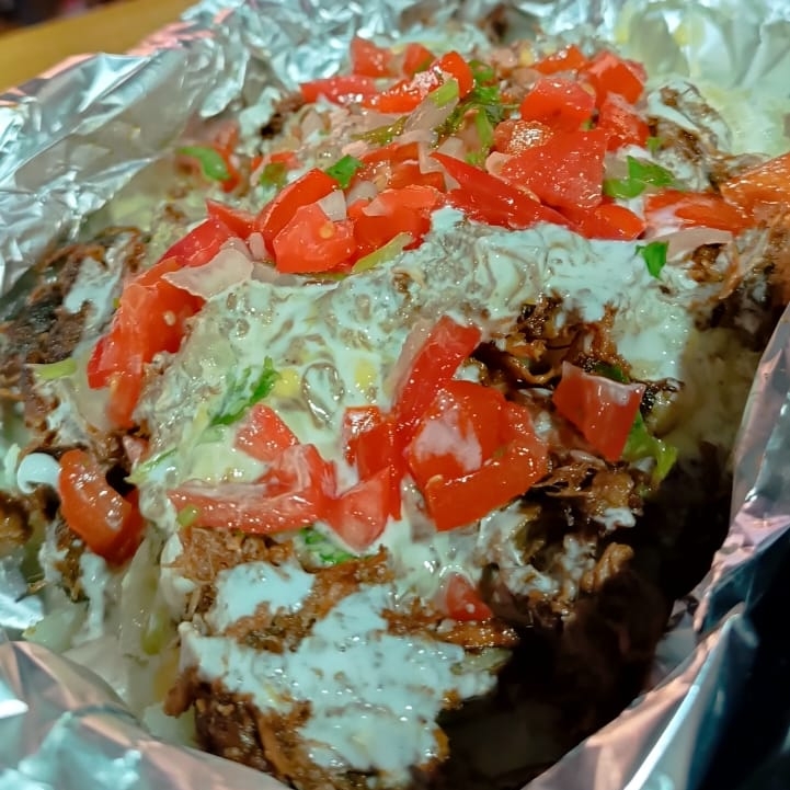 Exquisita, cremosa y muy suave papa, con un toque de mantequilla, queso gratinado, BarbacoaSLP y acompañado de totopos.