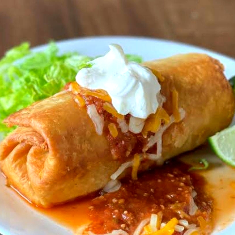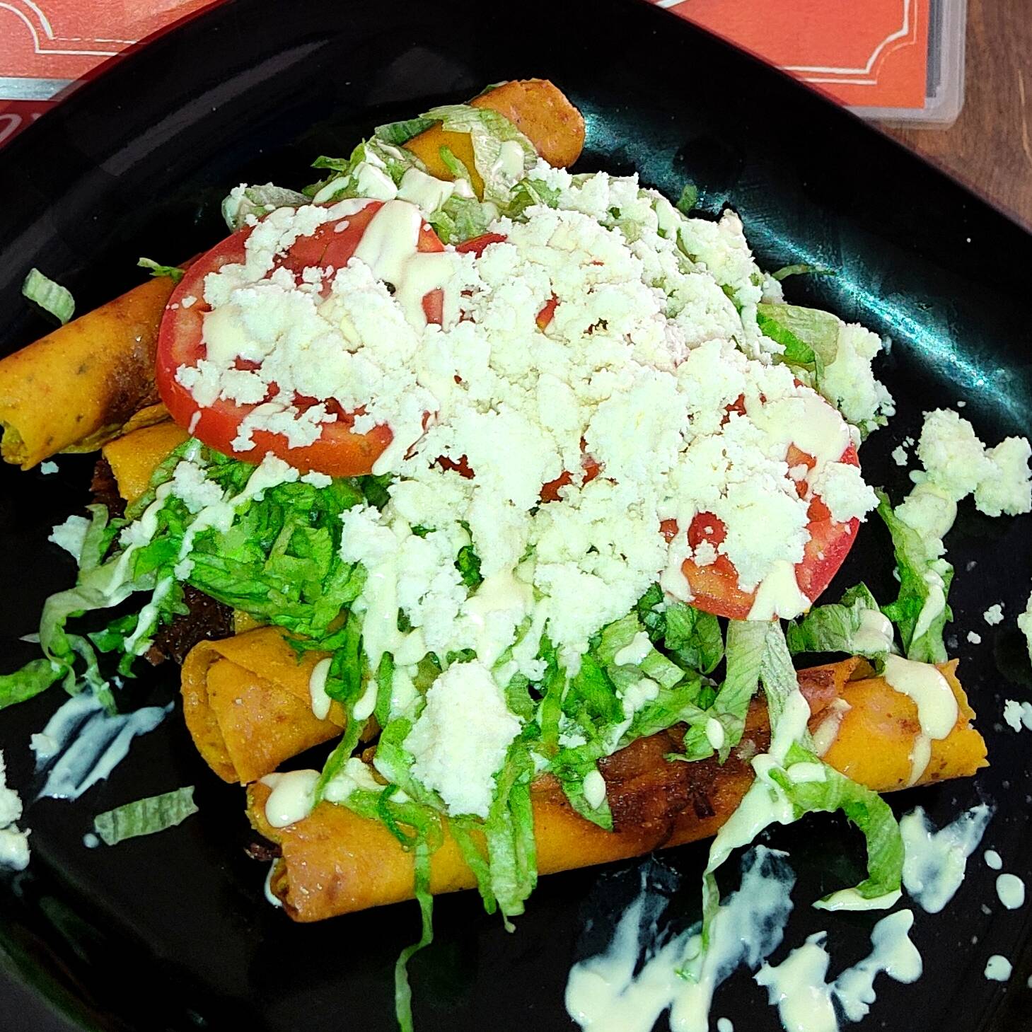 5 pz de flautas rellenas de BarbacoaSLP, preparadas con lechuga, jitomate, aguacate, crema y queso.