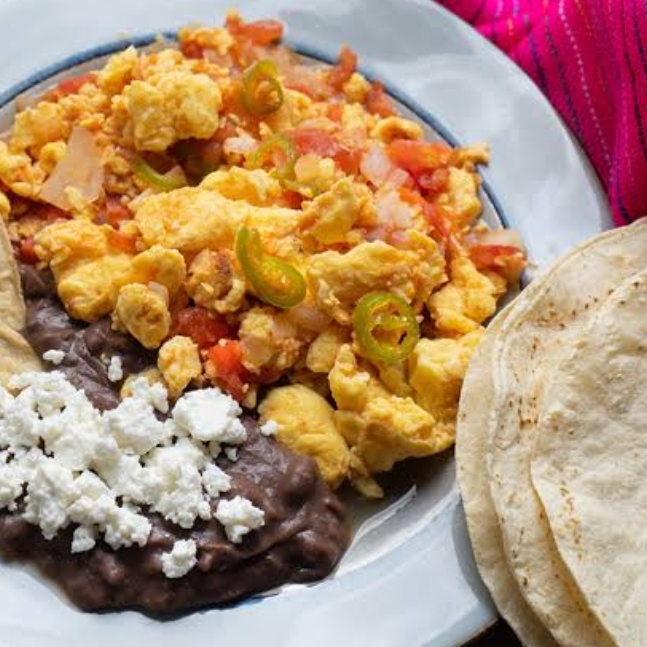 Huevos al gusto; incluyen frijoles refritos, tortilla de maíz.