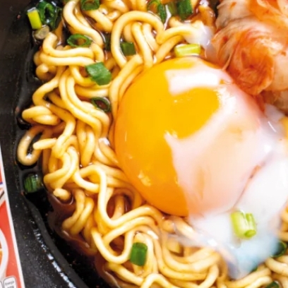 Fideos instantáneos sobre consomé, acompañado de huevo y cebollín.