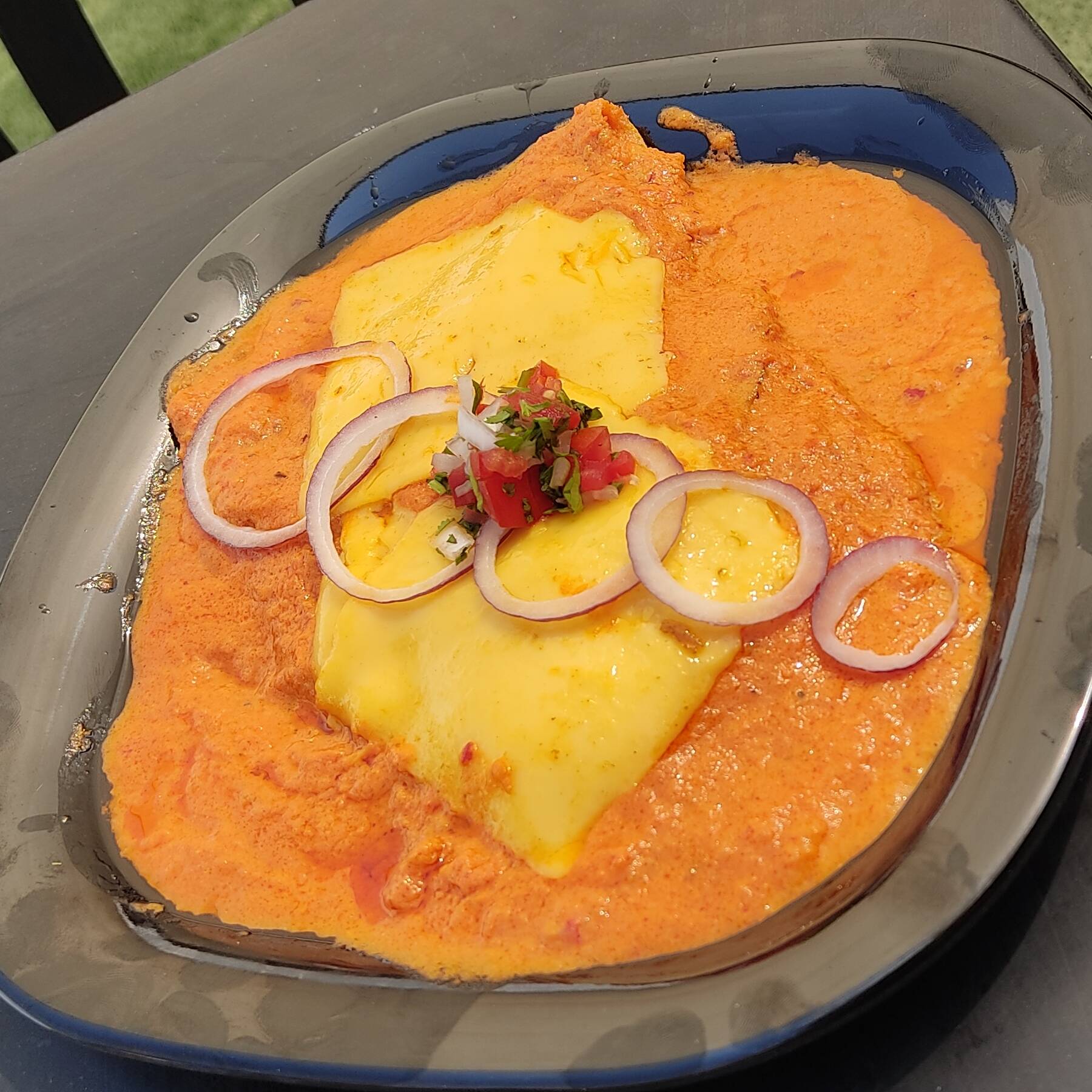 Exquisita, cremosa y muy suave papa, con un toque de mantequilla, queso gratinado, jamón, tocino, acompañado de totopos.