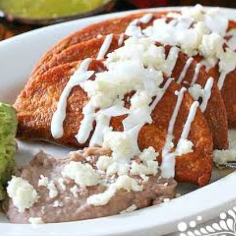 5 pz de enchiladas acompañadas de frijoles, crema, queso y aguacate.