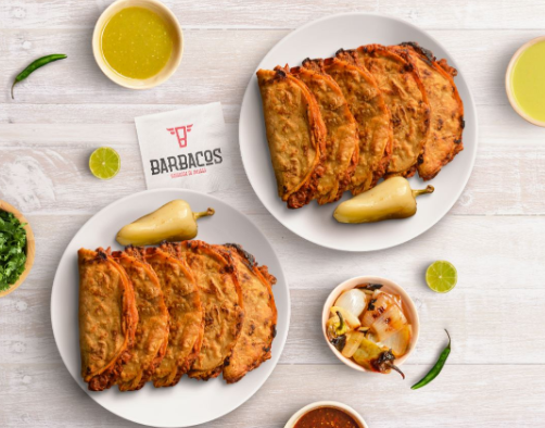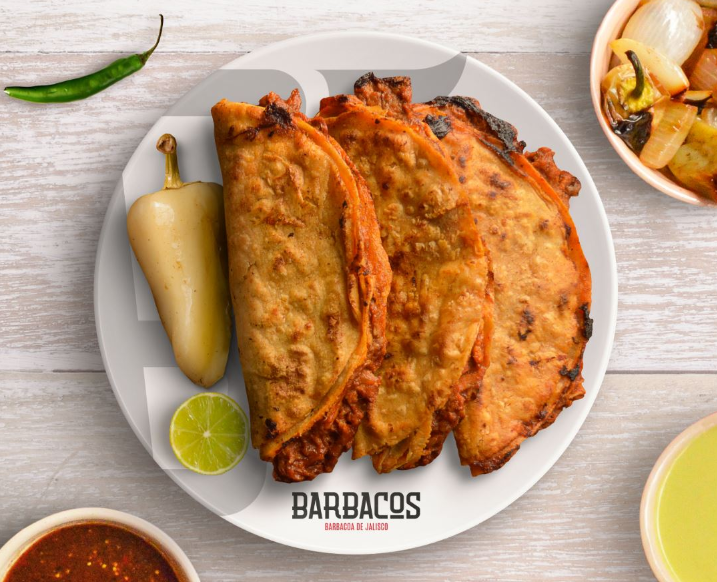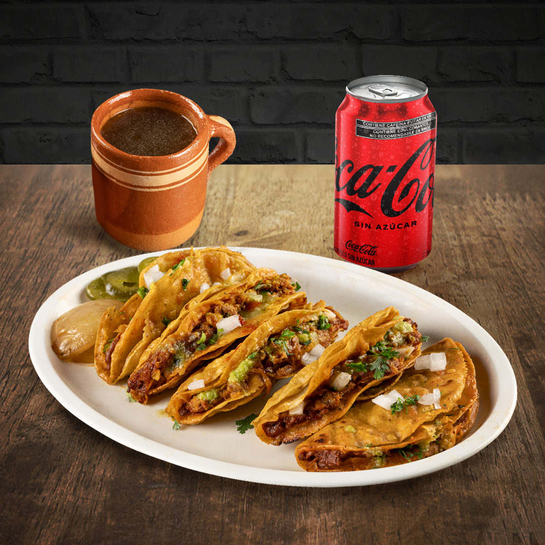 5 Tacos de barbacoa, 1 consomé, 1 bebida individual.