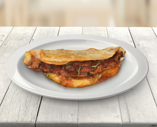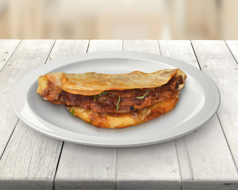 Una camita de barbacoa con queso fundido a la plancha sobre una tortilla de harina.