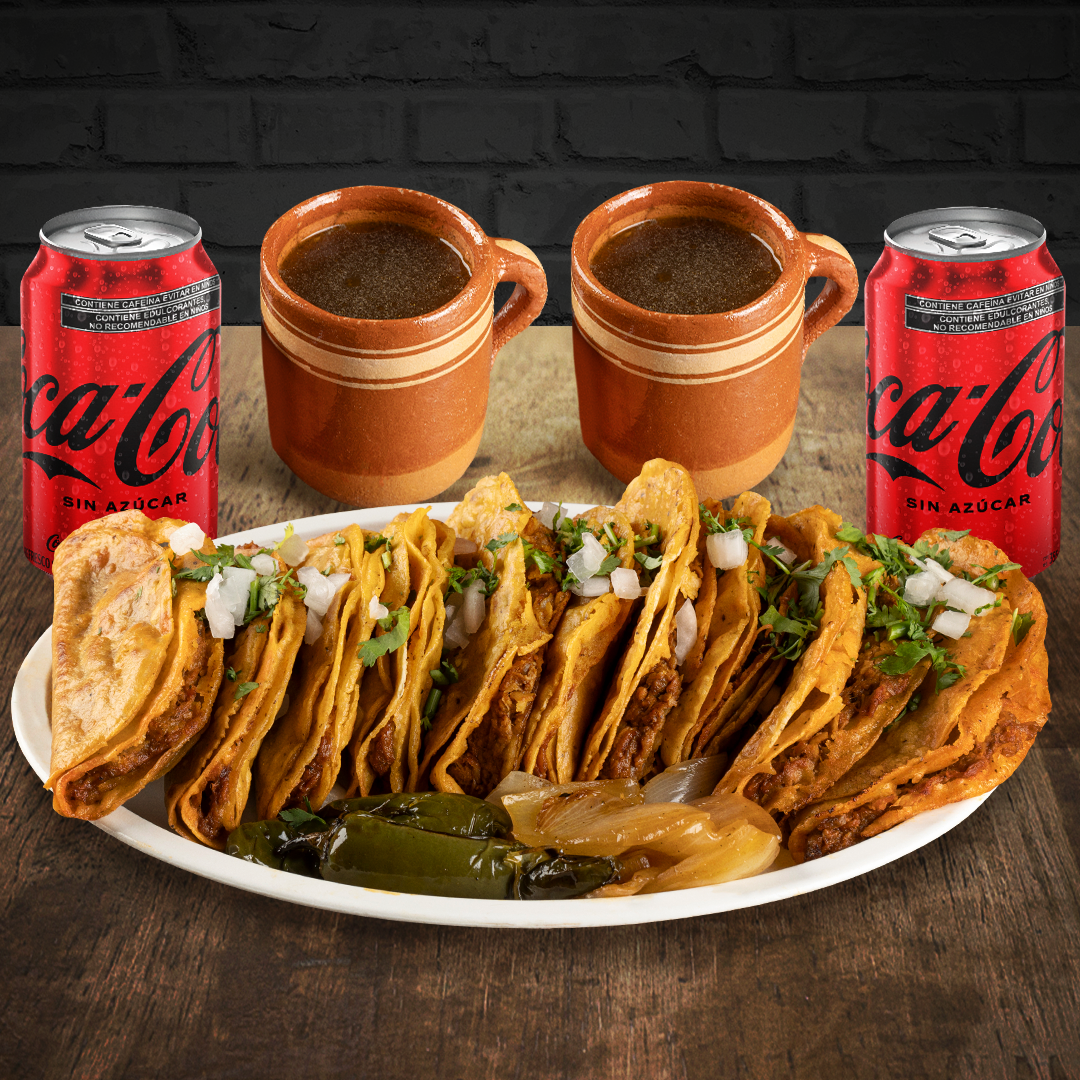 10 Tacos de barbacoa, 2 consomés, 2 bebidas individuales.