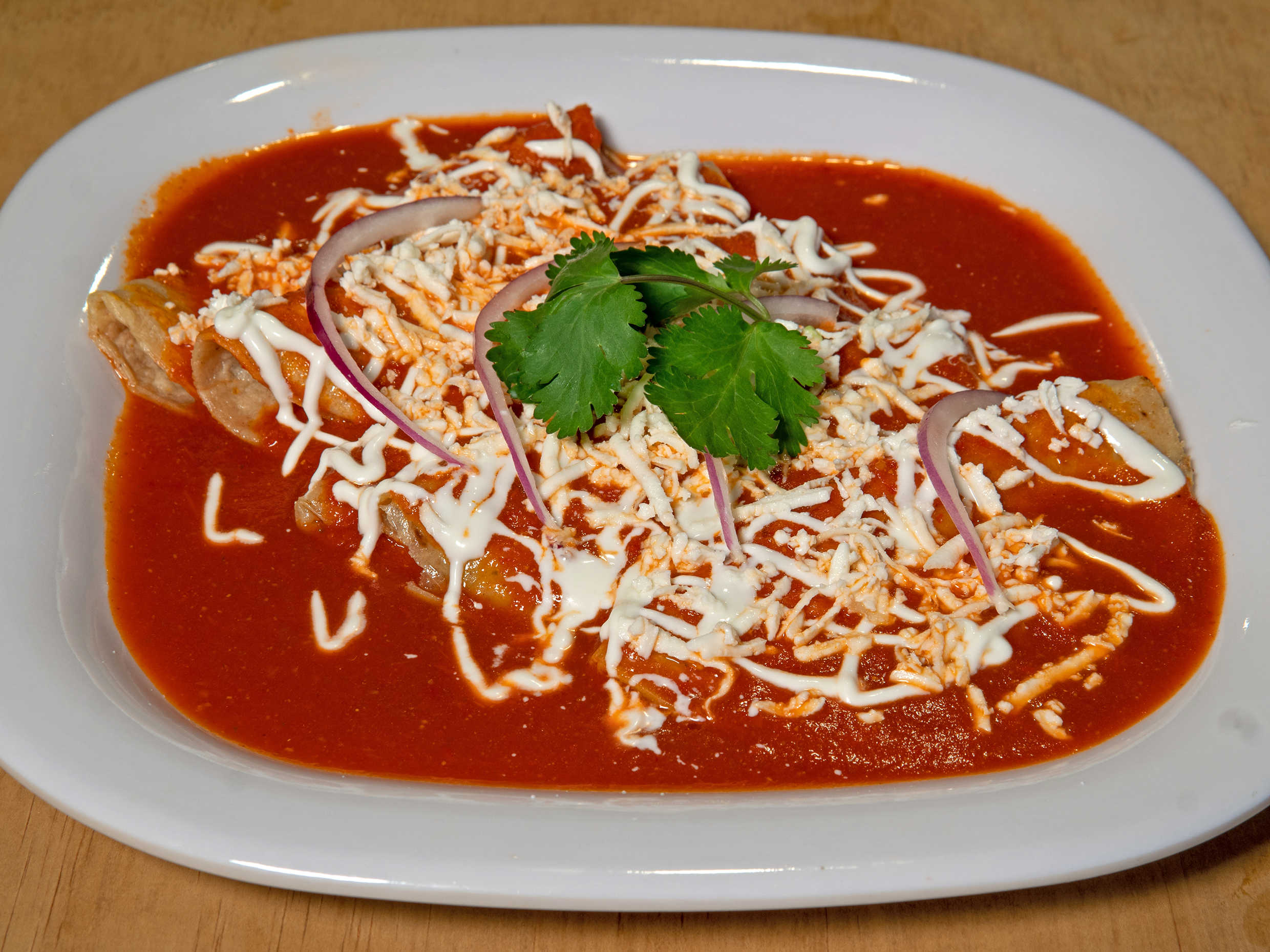 5 Taquitos rellenos de pollo bañados en salsa roja con crema y queso.