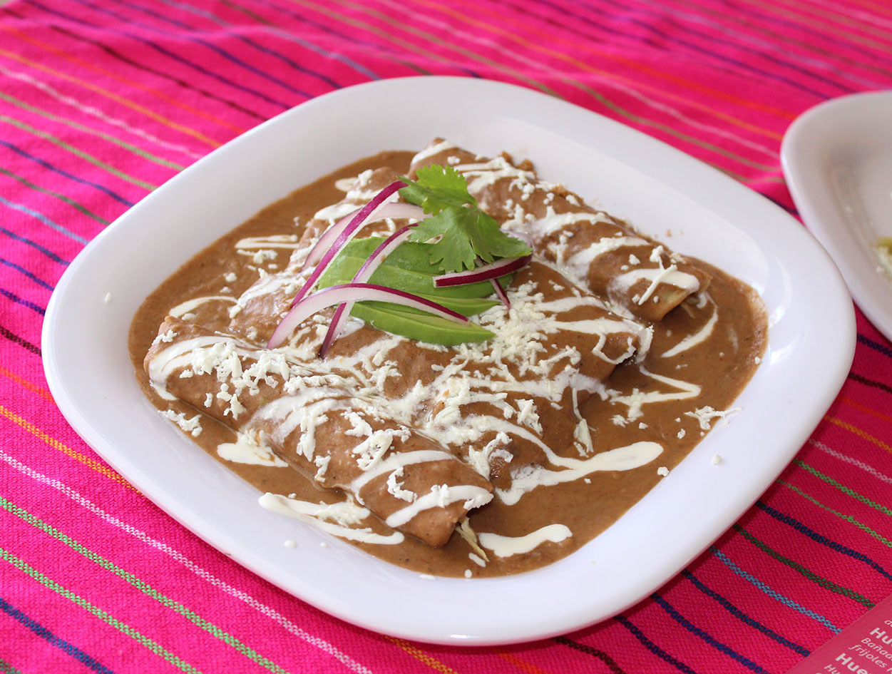 5 Taquitos rellenos de pollo bañados en salsa de frijol acompañados con aguacate.