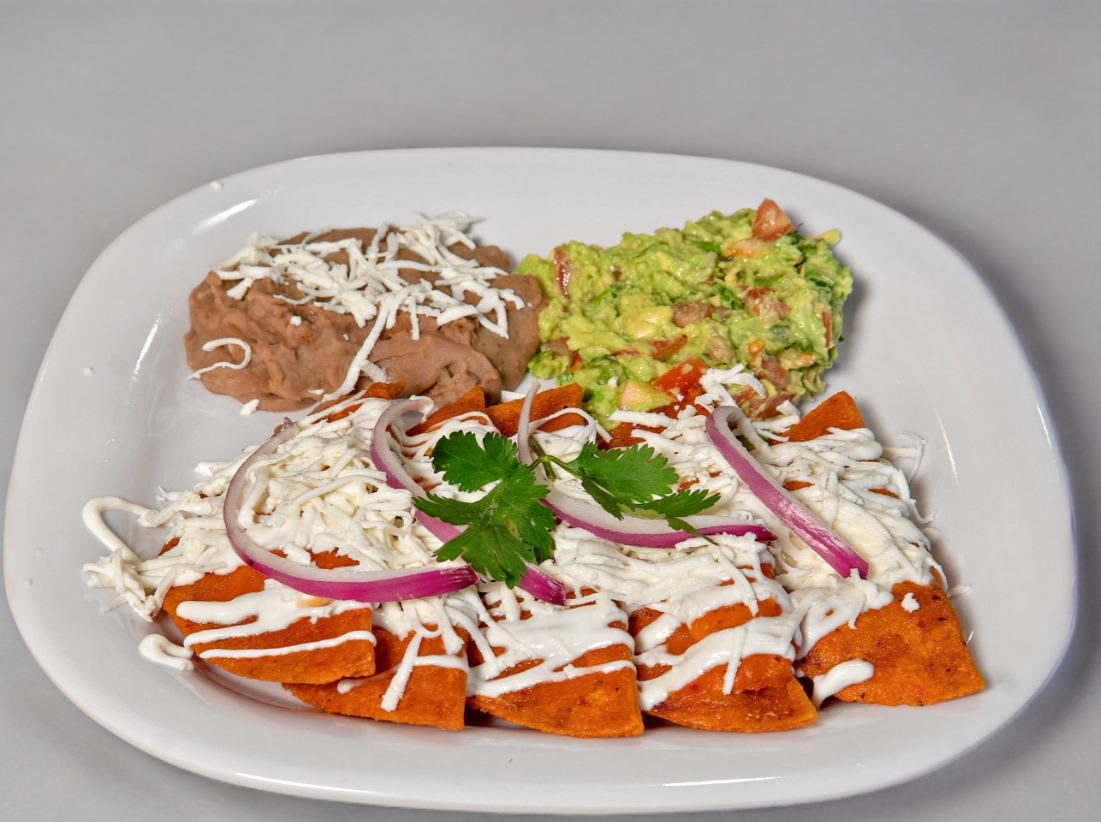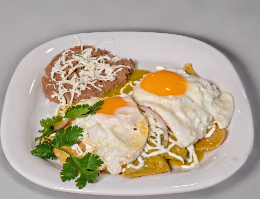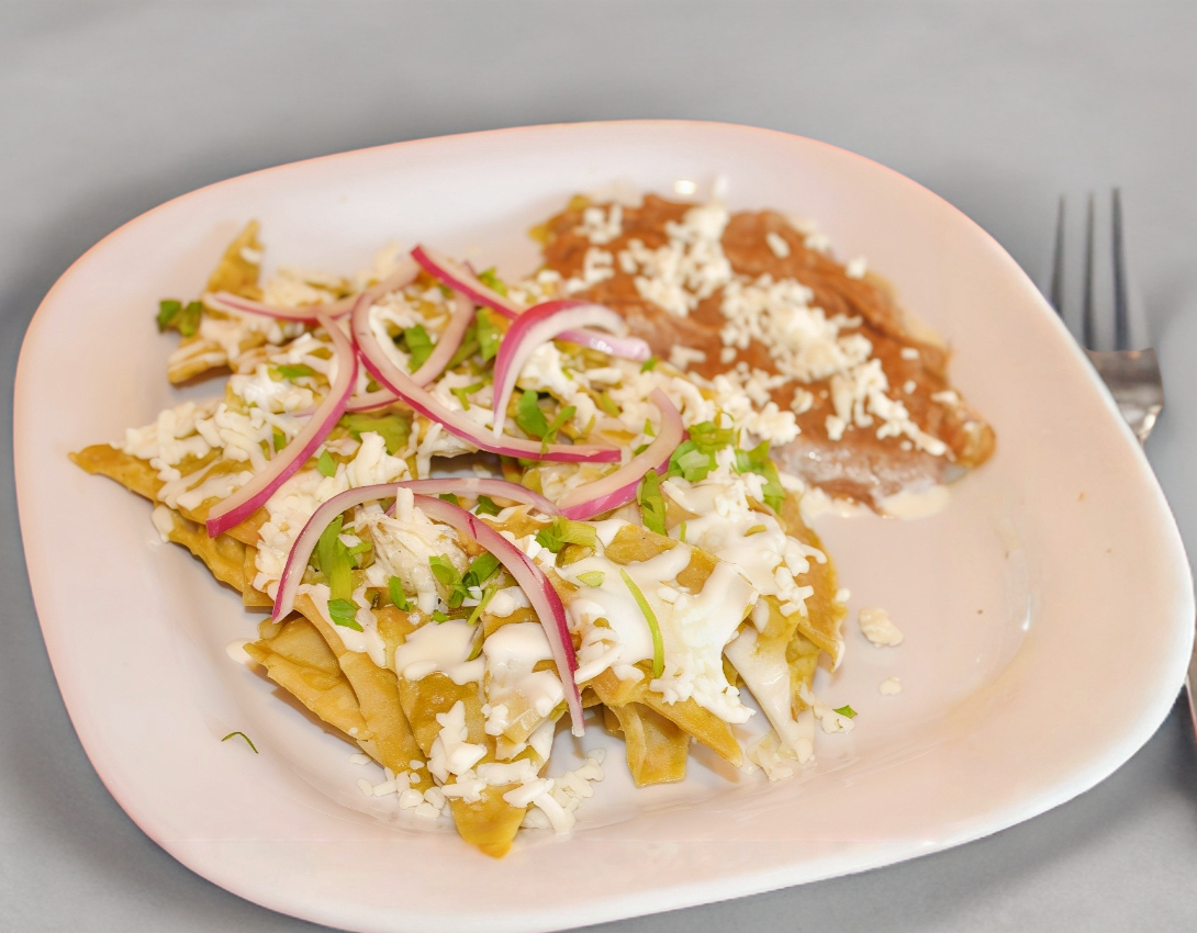 Chilaquiles verdes o rojos con crema, queso y cebolla morada acompañados de huevo estrellado o revuelto con frijoles refritos.