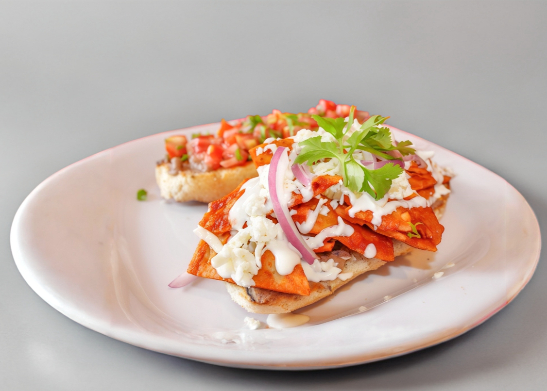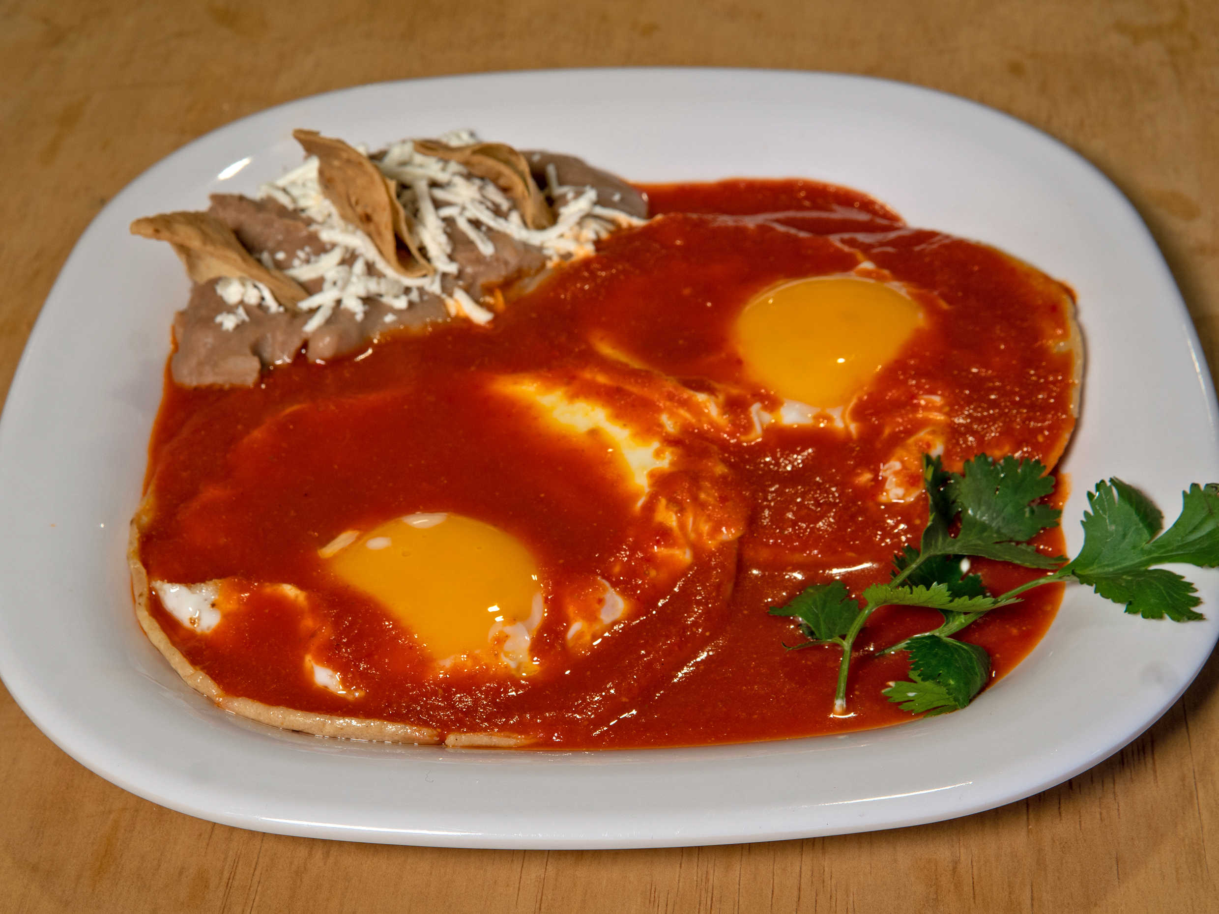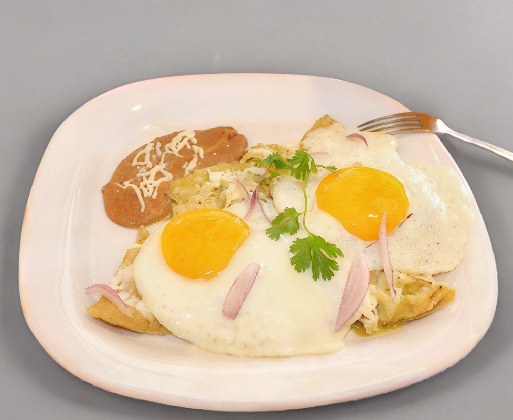 Huevos estrellados bañados en salsa roja o verde, acompañados de frijoles refritos. Incluye salsa y bolillo.