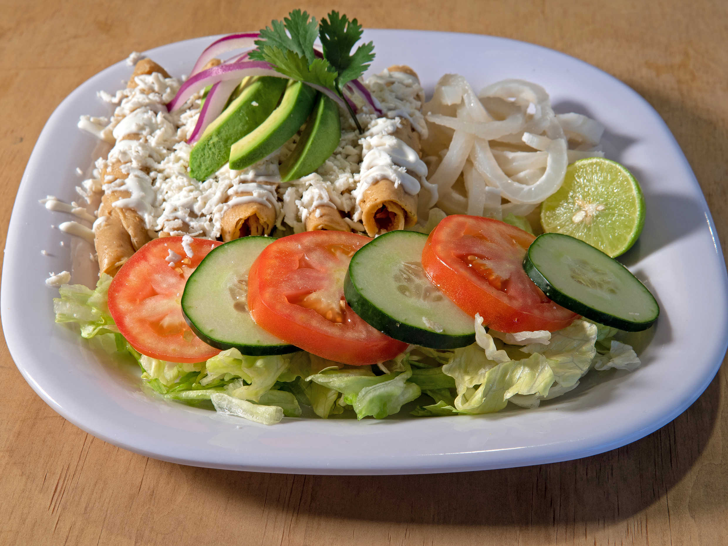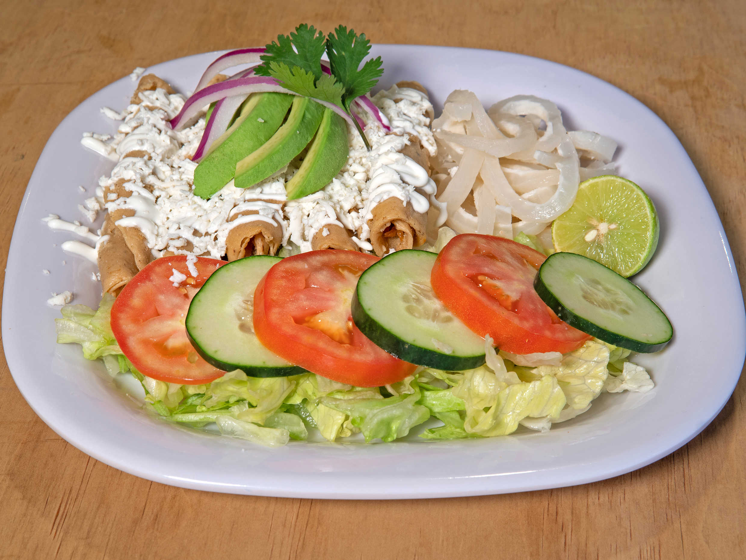 5 Flautas de pollo acompañadas de ensalada, crema y queso.