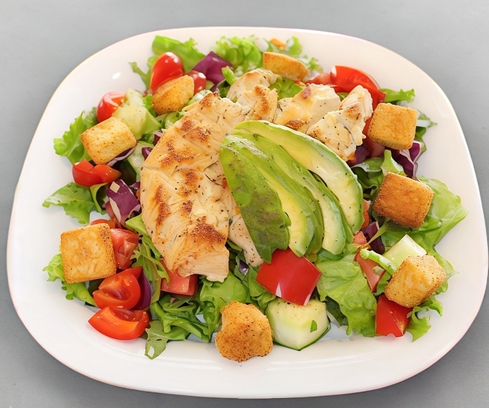 Mezcla de lechugas, espinaca, col morada, jitomate, pepino, pimiento, aguacate, semillas, crotones, y pollo a la plancha (200 gr).