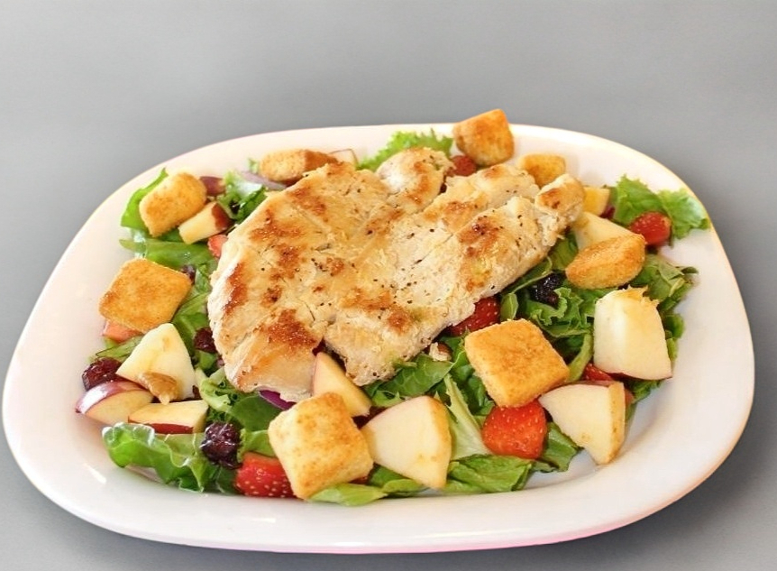 Mezcla de lechugas, espinaca, col morada, manzana, fresa, arándano, nuez, crotones, aderezo y pollo a la plancha (200 gr).