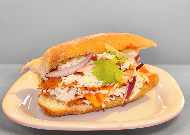 Torta de jamón con lechuga, queso panela, jitomate, aguacate, cebolla y mayonesa