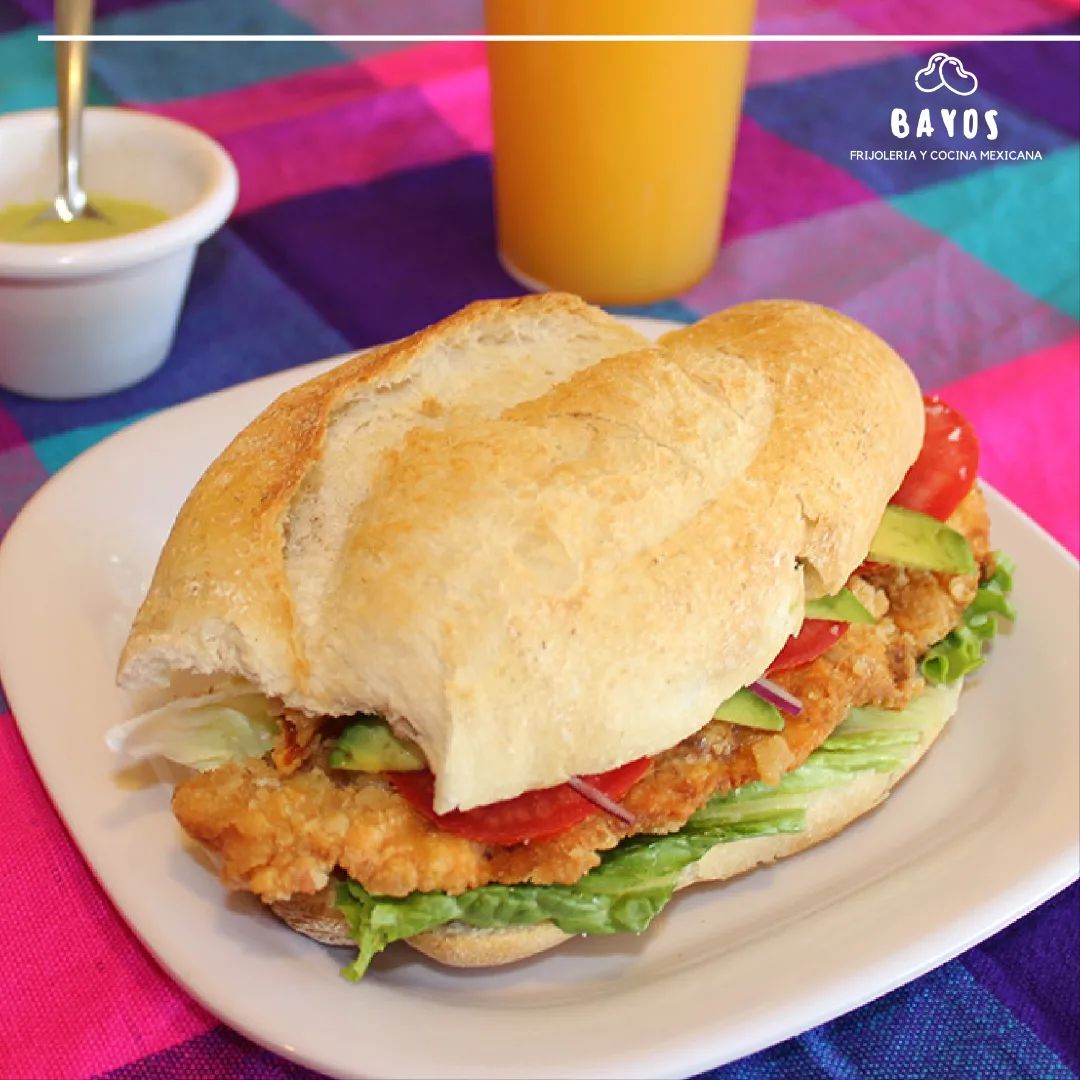 Torta de milanesa de pollo con frijoles refritos, lechuga, jitomate, aguacate, cebolla y mayonesa