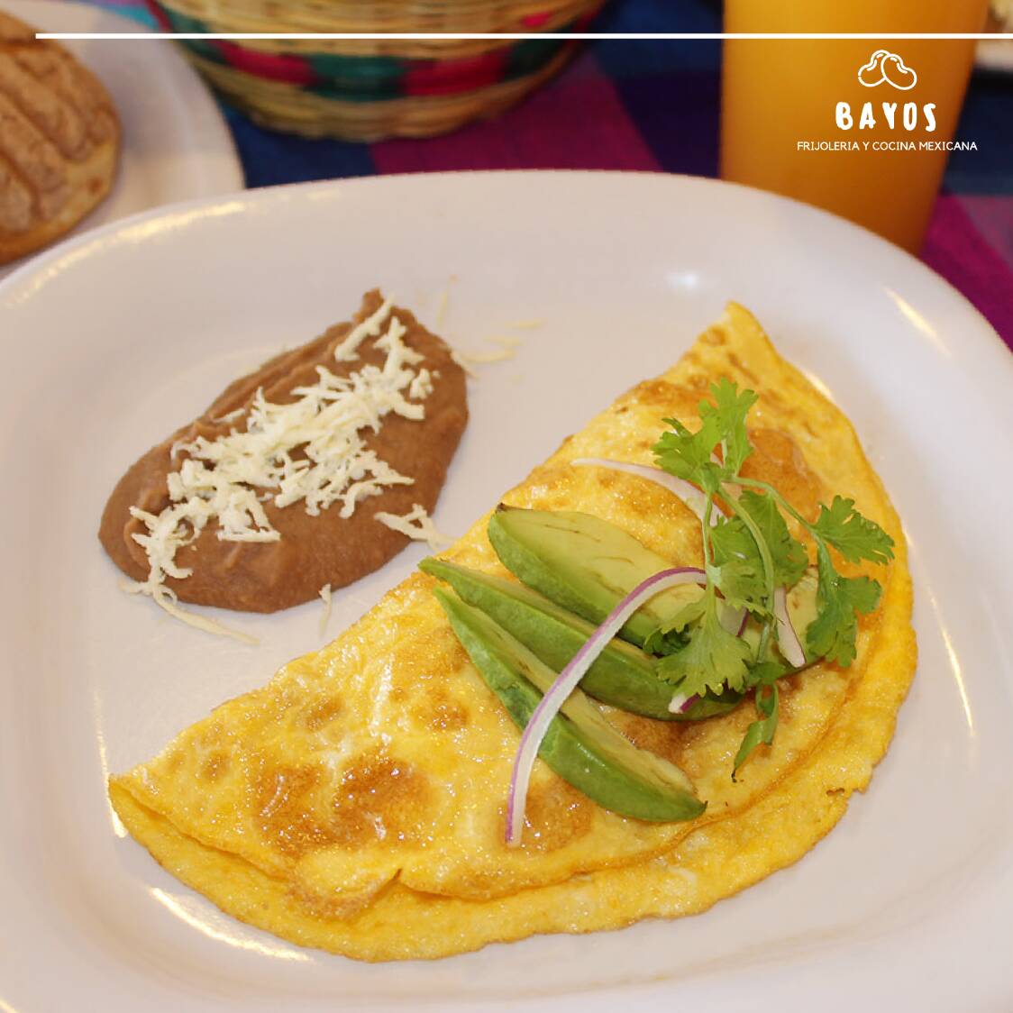Torta de huevo revuelto con tu ingrediente favorito acompañado de frijoles refritos.