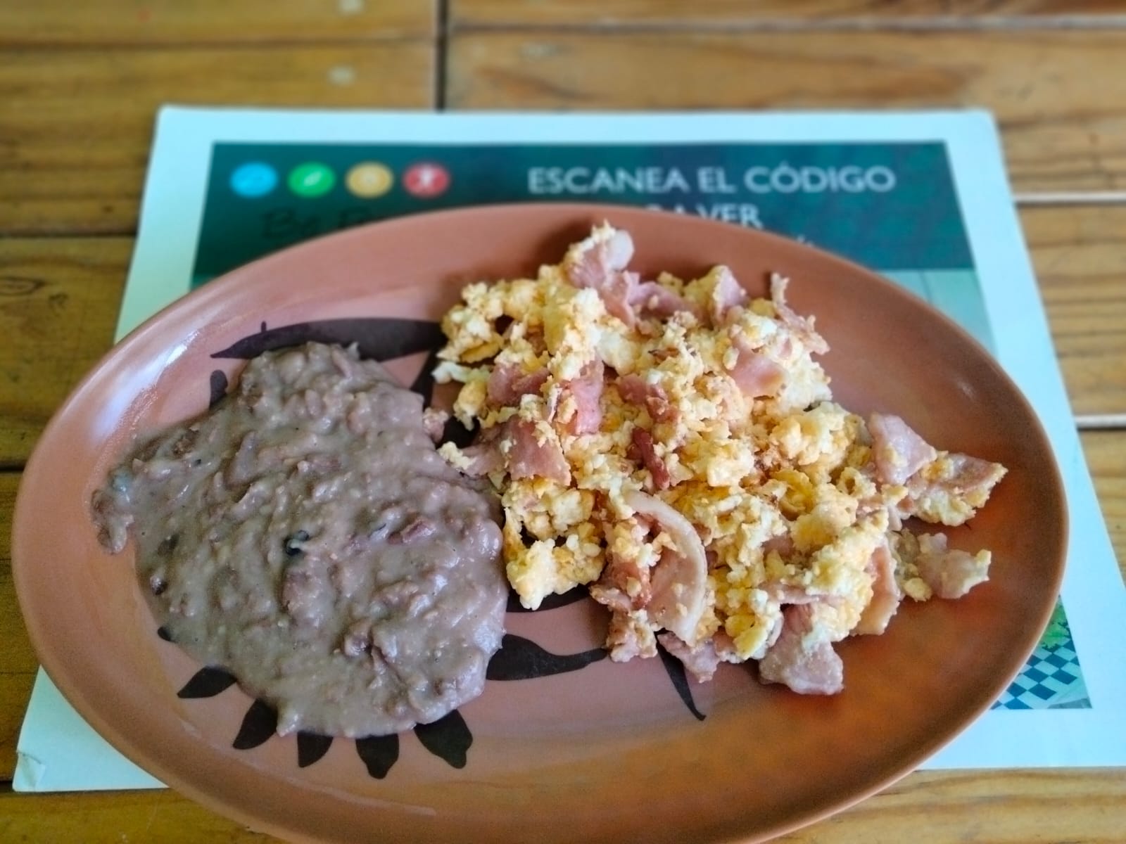 Huevos con jamón, o a la mexicana, o divorciados, o con verduras, o con chorizo; frijoles refritos (bolillo o tortillas).