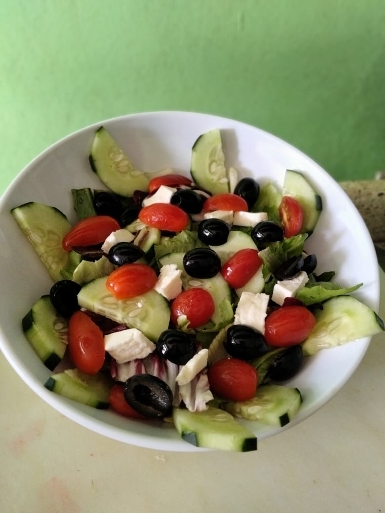 Mezcla de lechugas, pepino, jitomate Jerry, queso panela, aceitunas negras
