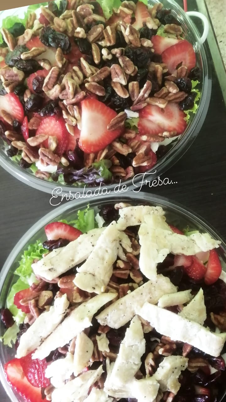 Mezcla de lechugas, fresa, queso panela, nuez, arándanos, aderezo