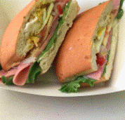 Pan tipo chapata, lechuga, pollo, queso asadero, jamón de pavo, tocino, jitomate asado, cebolla asada, aderezo mostaza miel, chile.