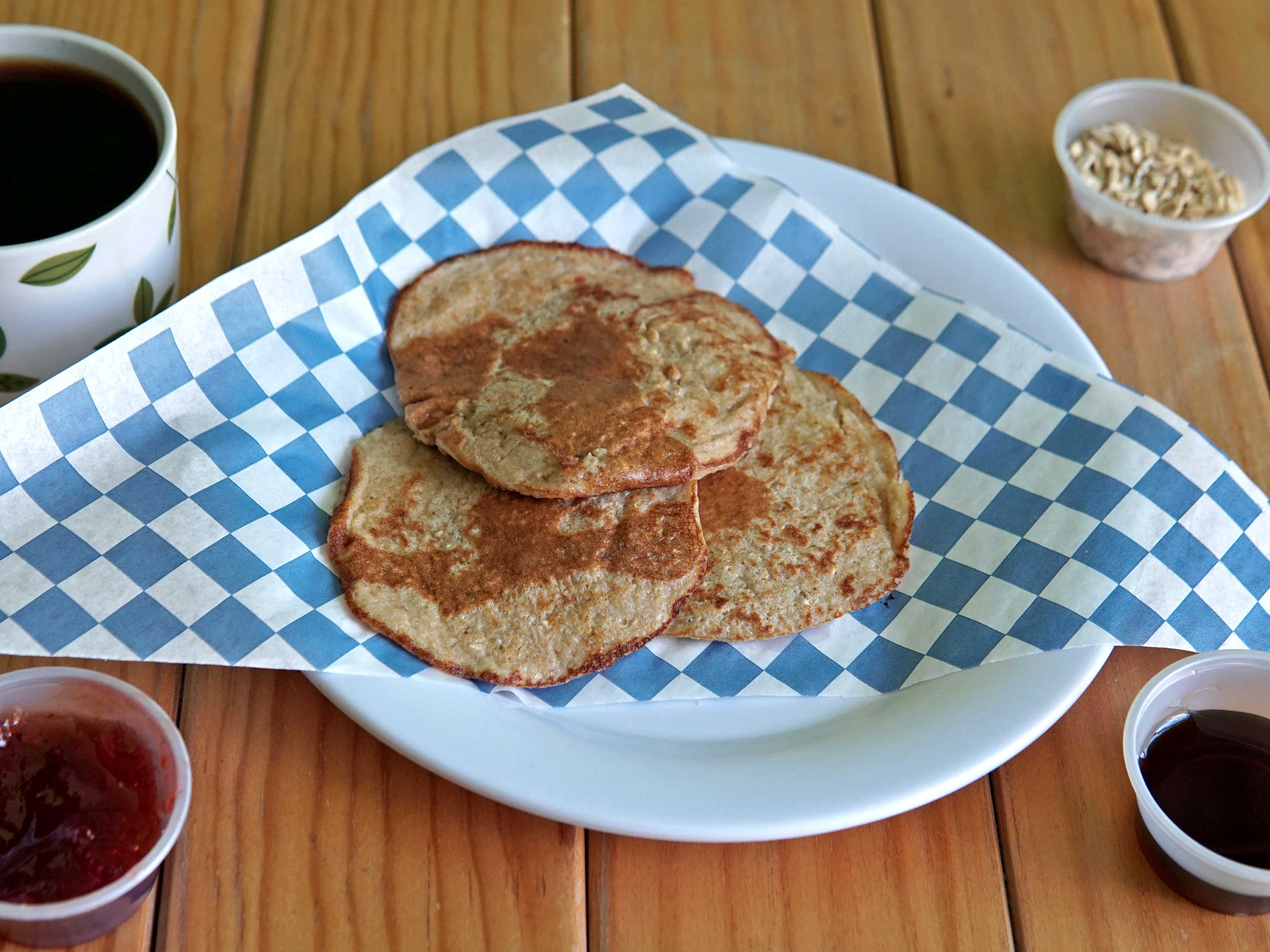 Avena, plátano, huevo, leche, vainilla, acompañado de miel maple, mermelada de fresa.