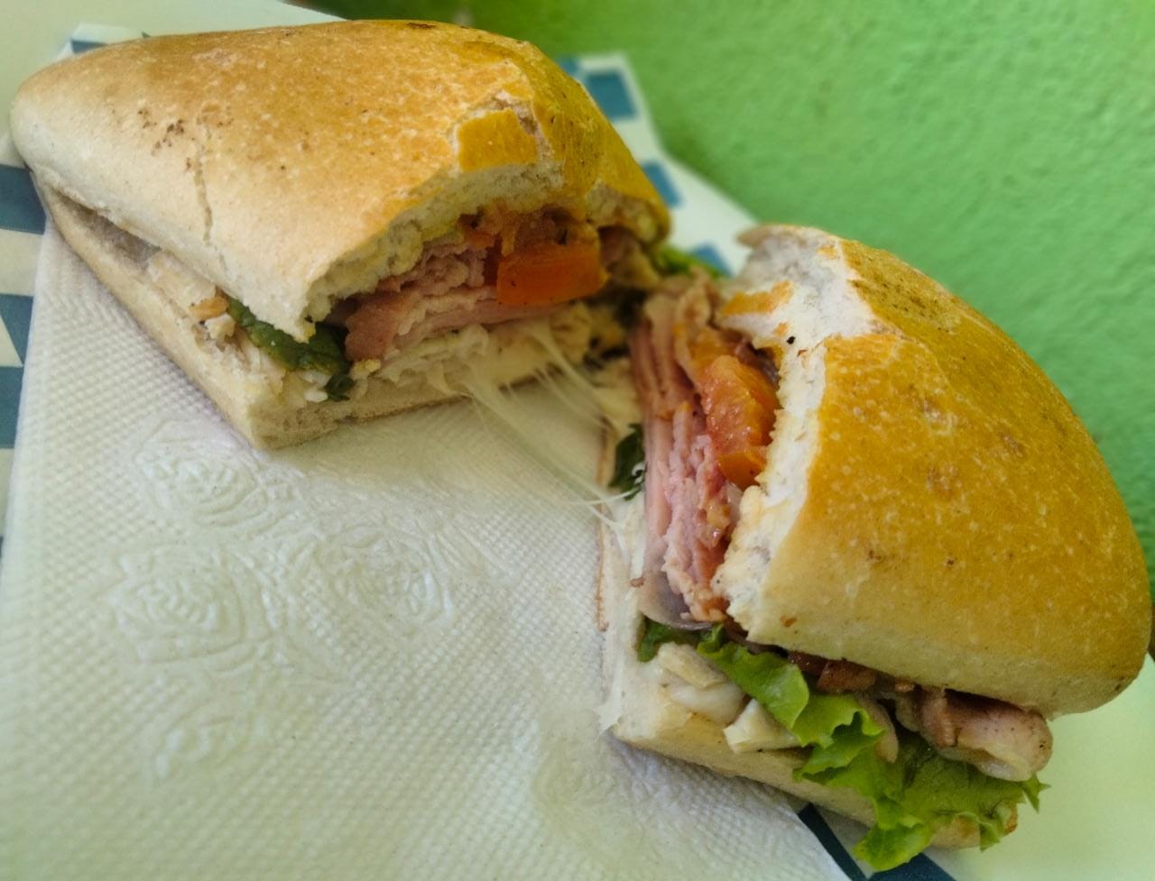 Pan integral, mayonesa, lechuga, jamón de pavo, jitomate, queso panela, aguacate, chile.