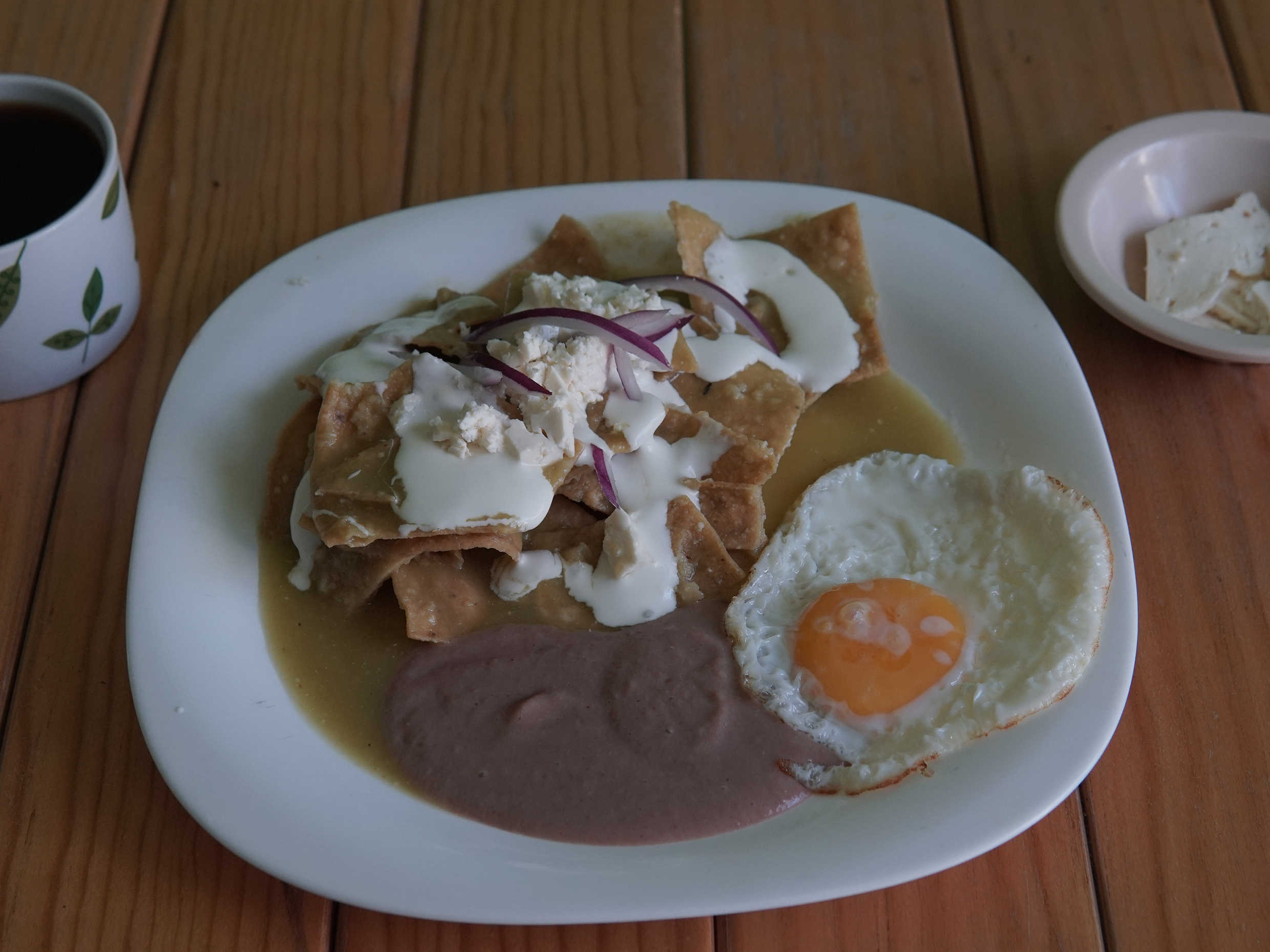 Chilaquiles verdes o rojos, con frijoles refritos, queso, crema, cebolla morada
