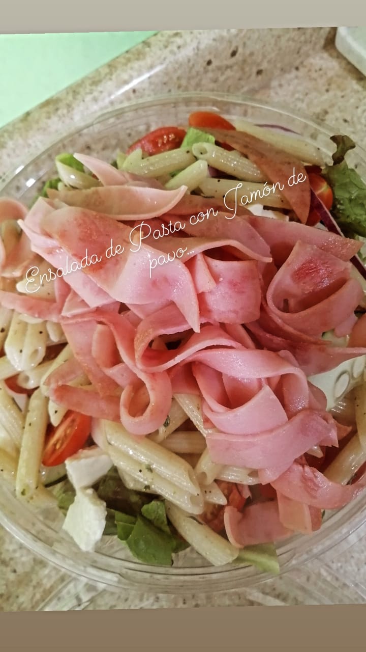 Mezcla de lechugas, pasta, Cherry, queso panela, pepino, cebolla morada